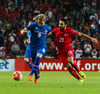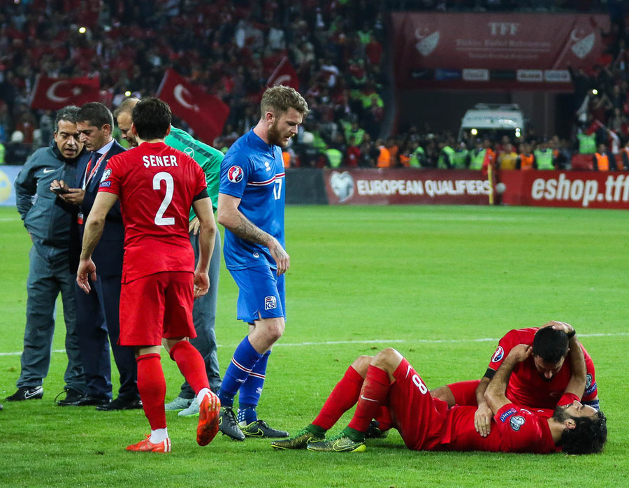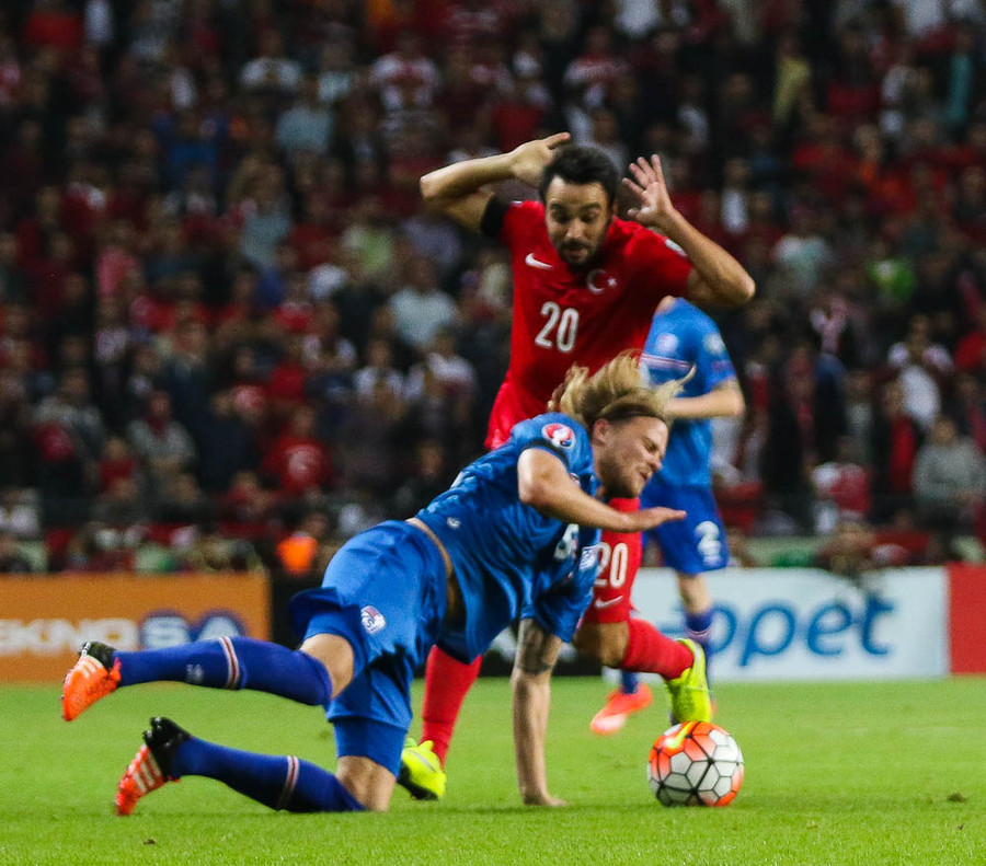 Arda Turan sýnir hvers hann er megnugur! Spænir sig í gegnum varnarmenn Íslands sem ná maunlega að stoppa hann í teignum!! Þarna skall hurð nærri hælum. Það verður að segjast að heimamenn hafa verið með talsverða yfirburði, strákarnir okkar ná ekki að halda boltanum neitt.