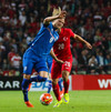 Íslendingar fá aukaspyrnu á hættulegum stað, brotið á Ara Frey. Sjáum hvort þetta verði vel nýtt!