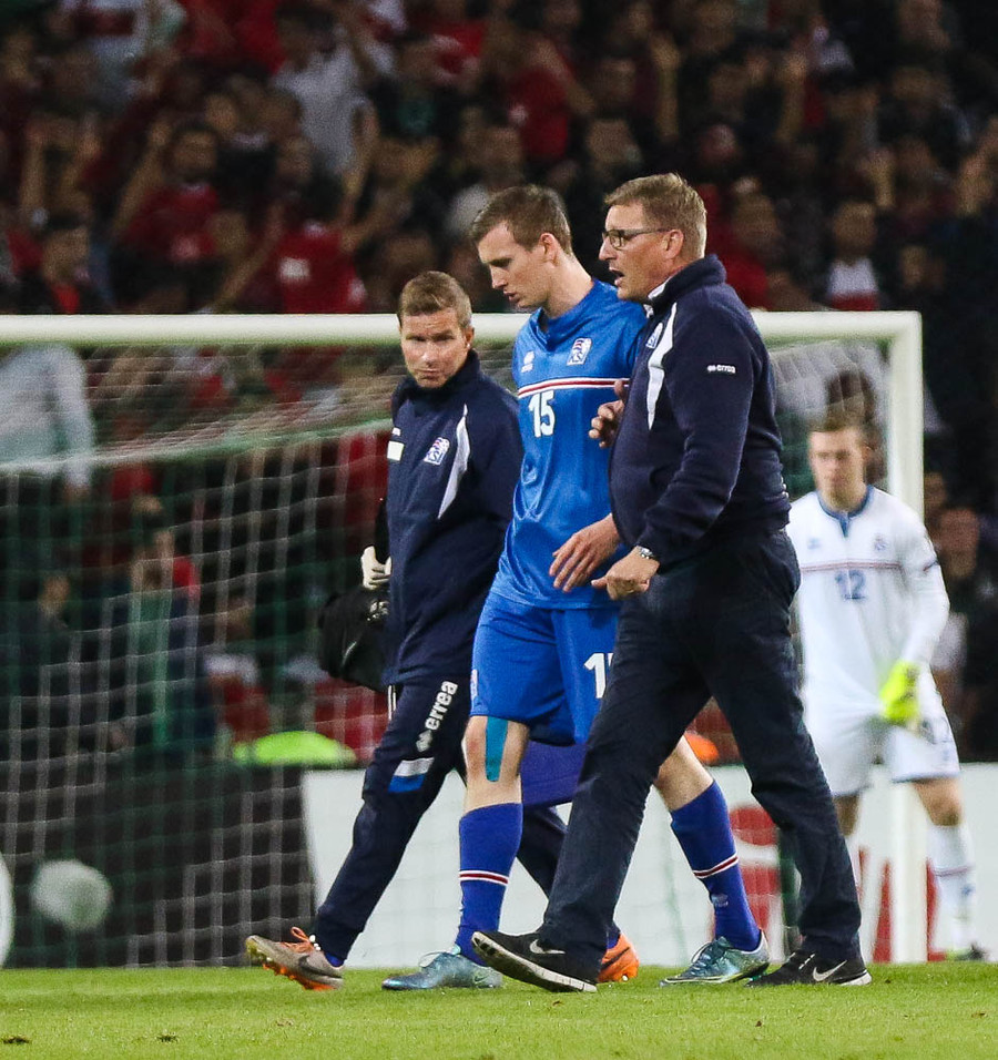 Jón Daði er kominn á lappir og til í að fara aftur inn á. Þetta var svo rautt að það hálfa væri nóg, takkarnir í ökklana/kálfana. Nú skulum við bara sækja stigin þrjú!!!