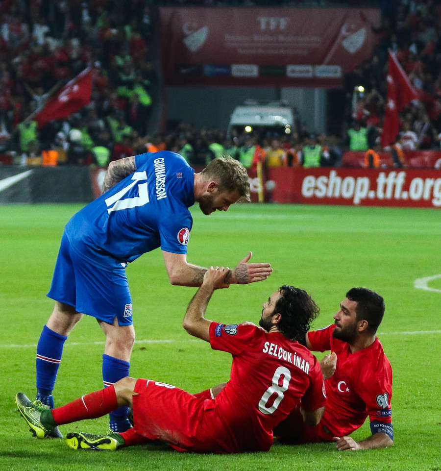 Gylfi liggur eftir eitt tyrkneskt brot en stendur aftur upp. Vonandi er þetta ekki alvarlegt.