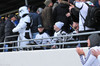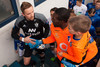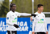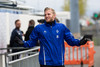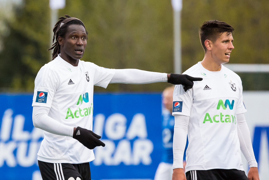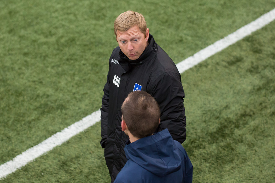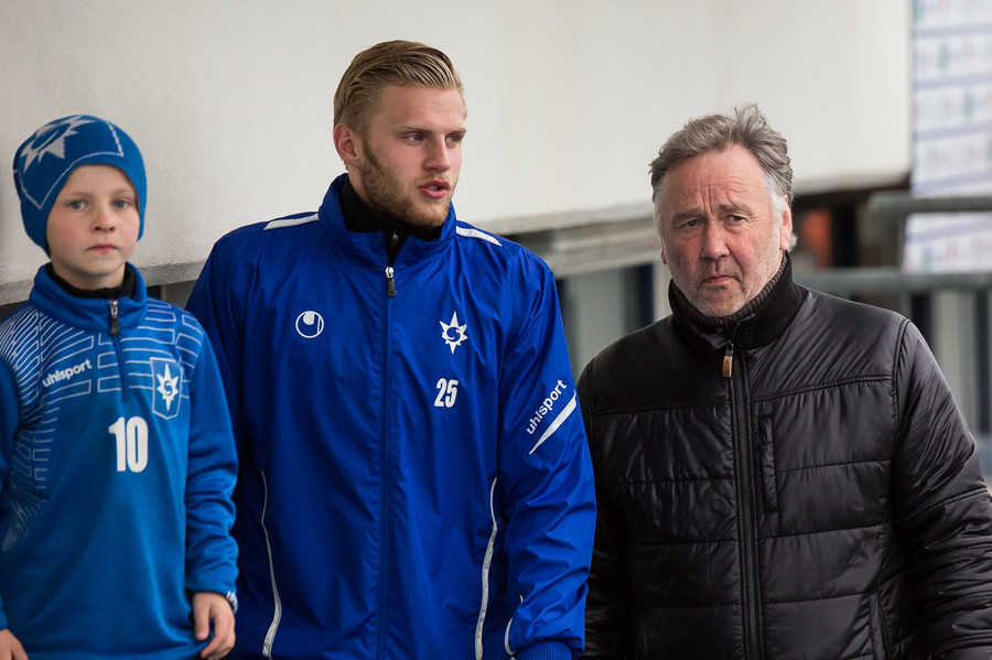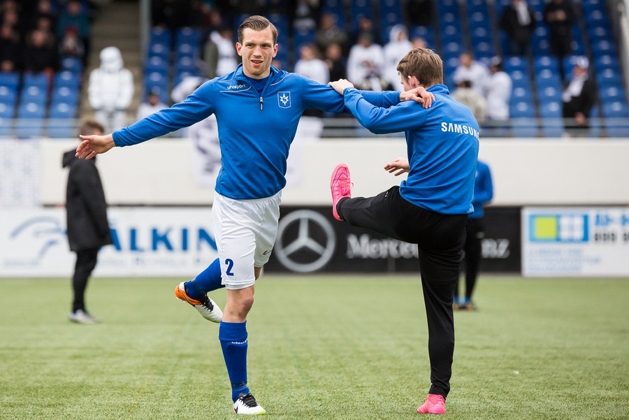 Liðin eru komin á völlinn. Duwayne Kerr er skærbroandi að þakka stuðningsmönnum Stjörnunnar fyrir góða stemningu. Gunnar Nielsen eitthvað minna glaður.