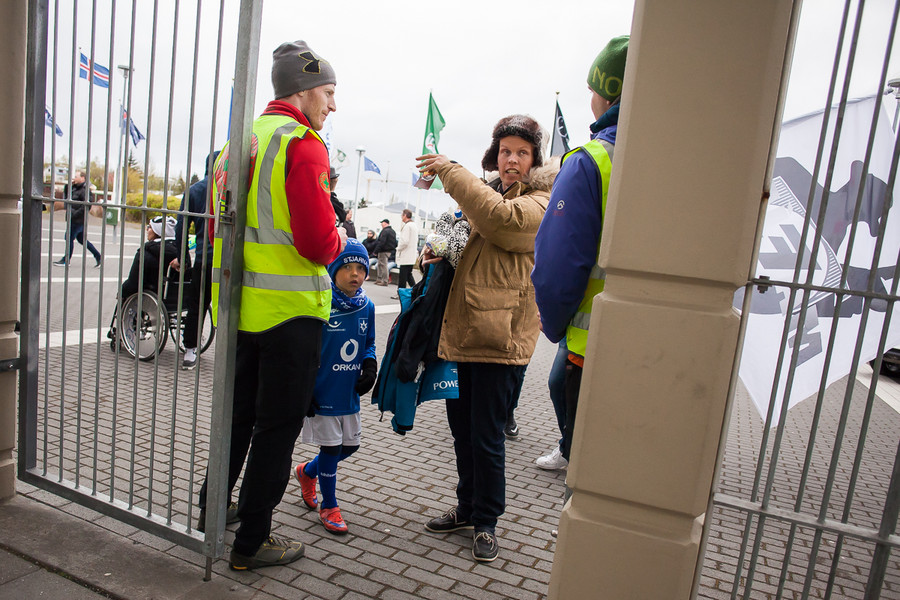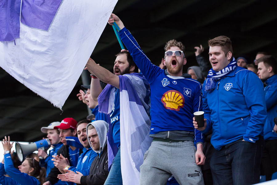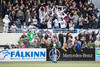 Strax komnið slatti af stuðningsmönnum Stjörnunnar. Júdas, Júdas, Júdas er kallað á Gunnar Nielsen sem labbar inn á völlinn. Hann brosir og veifar til þeirra.