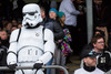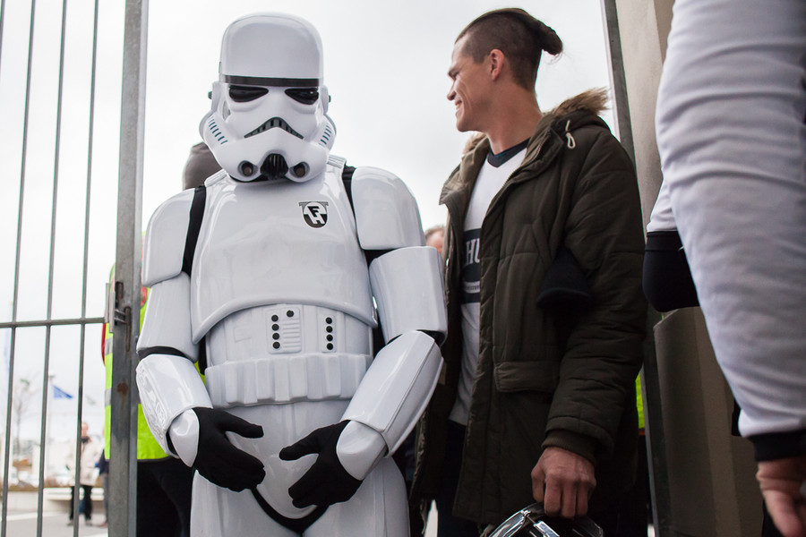 Stuðningsmaður FH í Storm Trooper búning að syngja Star Wars lagið. Vel gert.