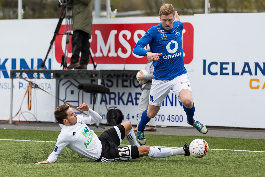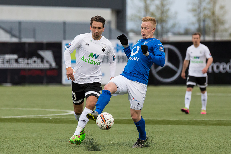 Halldór Orri kominn í góða stöðu í teig FH-inga þegar Atli Guðna kemur á ferðinni og bjargar. Vel farist hjá sóknarmanninum.