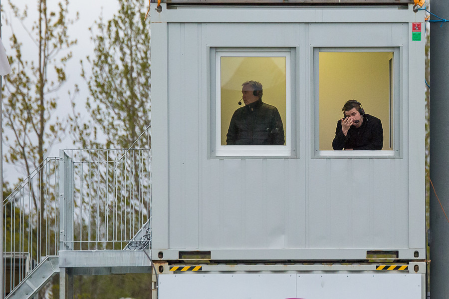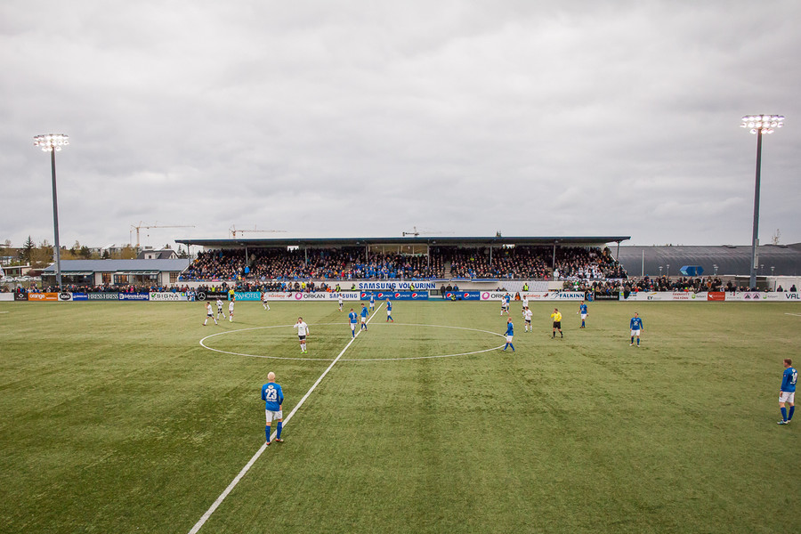 Fimm mínútur í leik og spennan nær heldur betur upp í blaðamannastúkuna. Svolítið hvasst í Garðabæ.