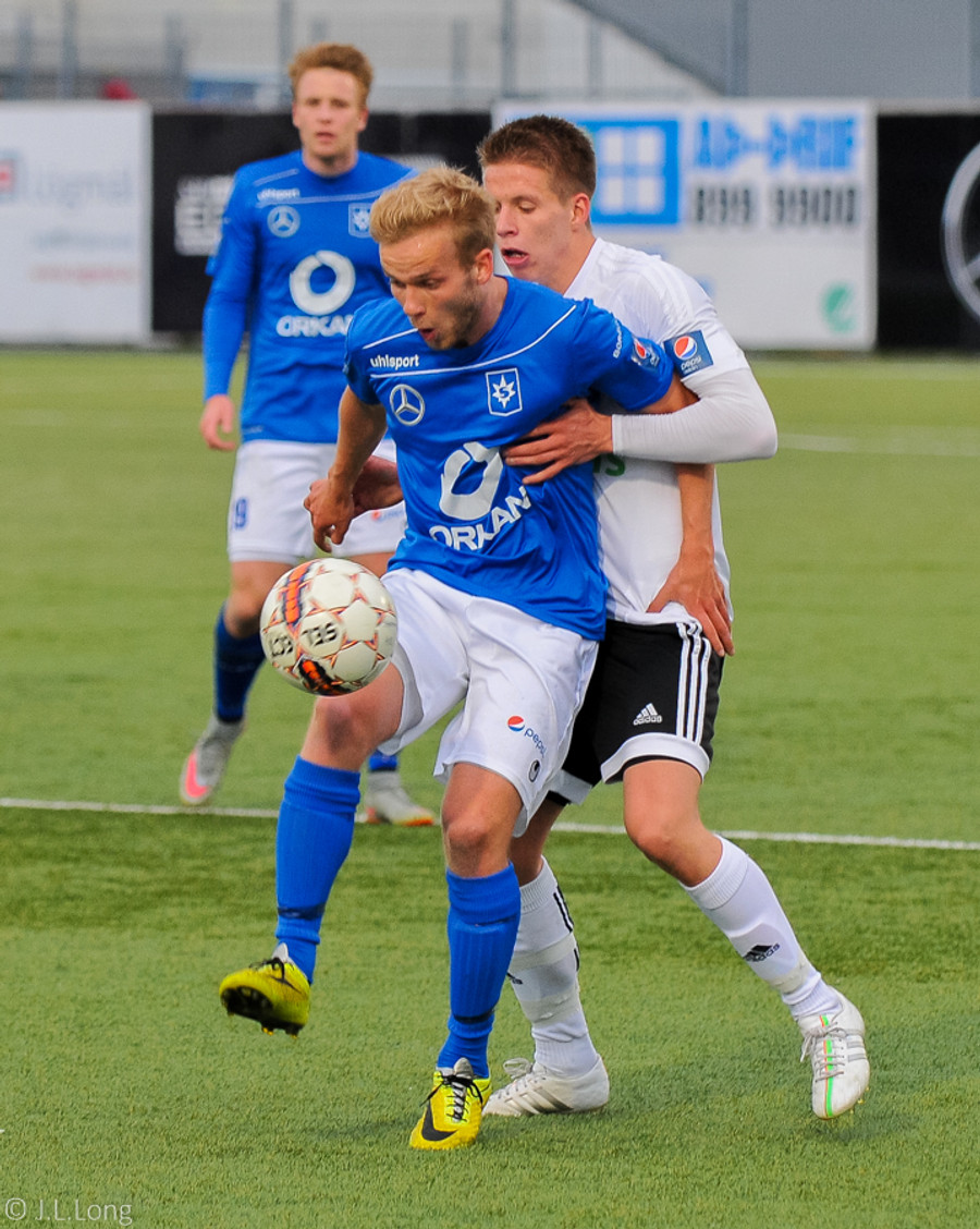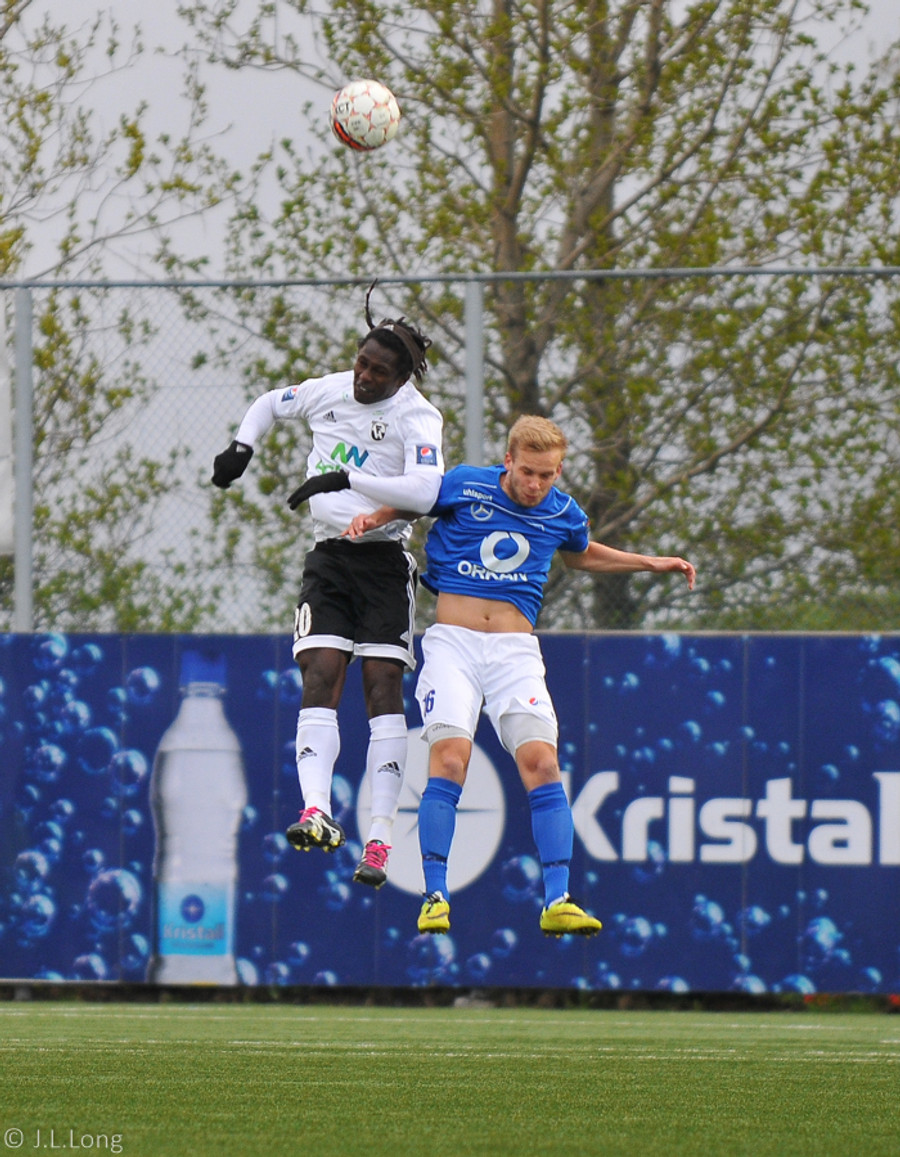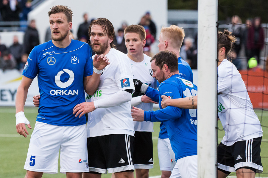 Kassim Doumbia ákvað bara að klobba Þorra Geir sem síðan braut af honum. Þorri verður að passa sig, er á gulu spjaldi.