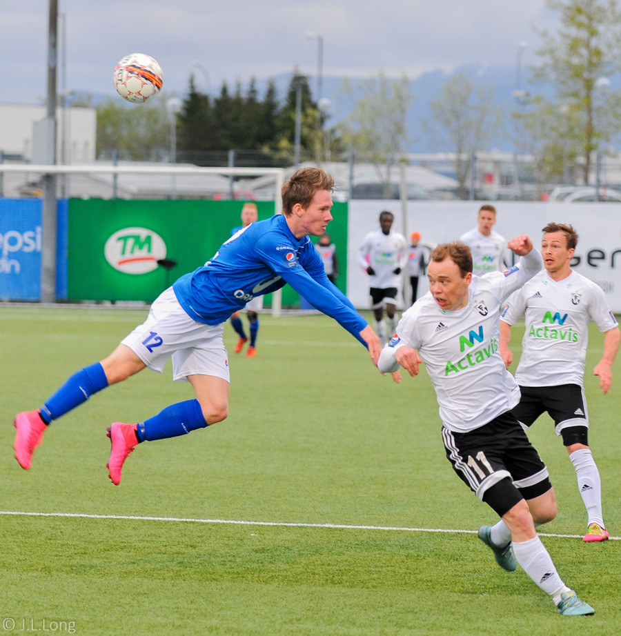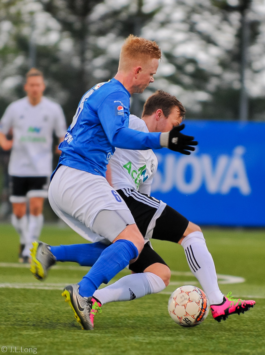 Sparkaði í Þórarinn Inga sem var á undan honum í skoppandi bolta. Þorri fór með löppina og Þórarinn með höfuðið.