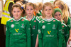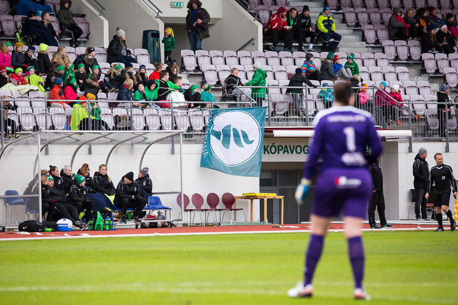 Áhorfendur eru enn að tínast á völlinn en hér fyrir framan mig situr hópur ungra iðkenda Breiðabliks og hvetur sínar konur til dáða.