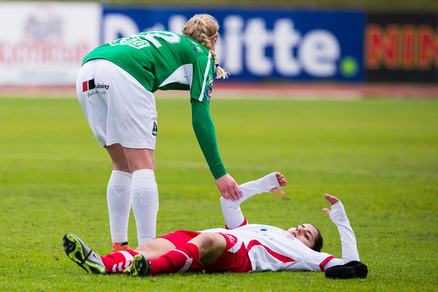 Þarna var Natalia Esteva heppin. Hún var alltof sein í tæklingu og fór í Fanndísi. Hjalti sleppir þessu en þetta leit ekki vel út.