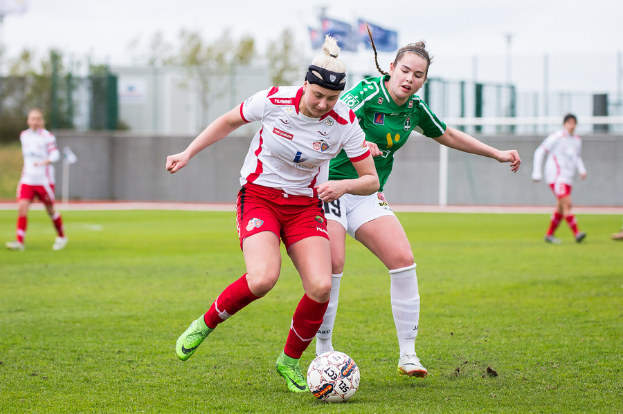 Fanndís tekur á rás á miðjum vallarhelmingi gestanna og lætur vaða utan teigs. Hörkuskot en það er vel yfir. Fanndís er að spila á öðru tempói en aðrir leikmenn hér í dag.