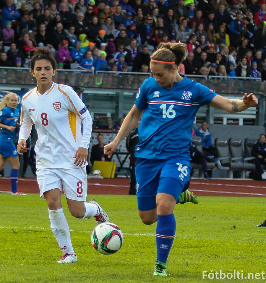 Sara Björk með gott skot utan teigs sem syngur í markinu. Þær eru að fara illa með þær makedónsku.