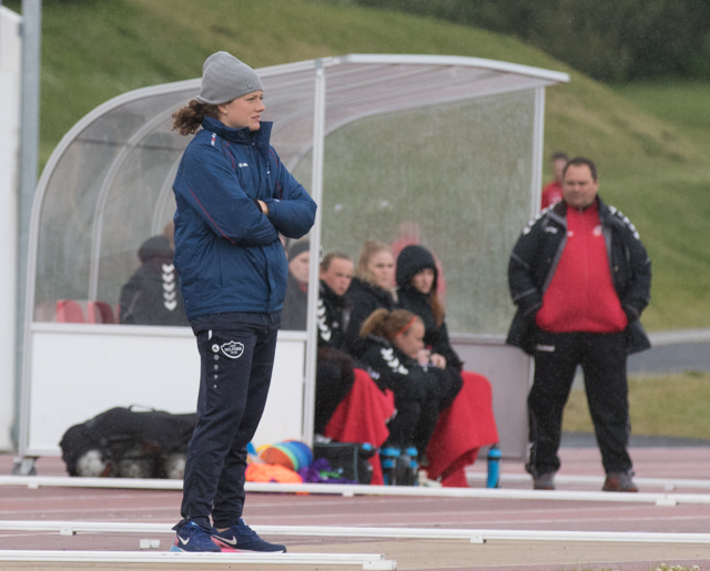 Hrafnhildur Hauksdóttir er útaf vellinum að fá aðhlynningu. Sjúkraþjálfarinn gefur merki um skiptingu. Lýtur ekkert sértaklega vel út