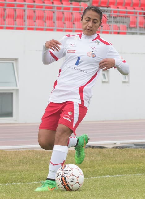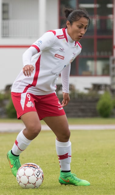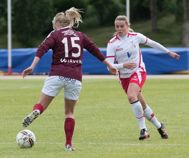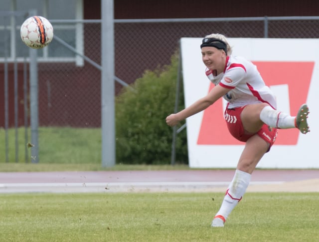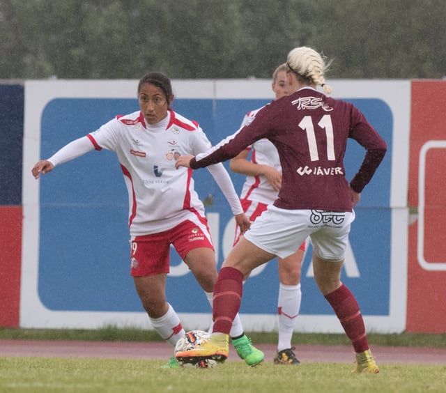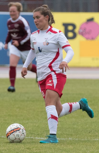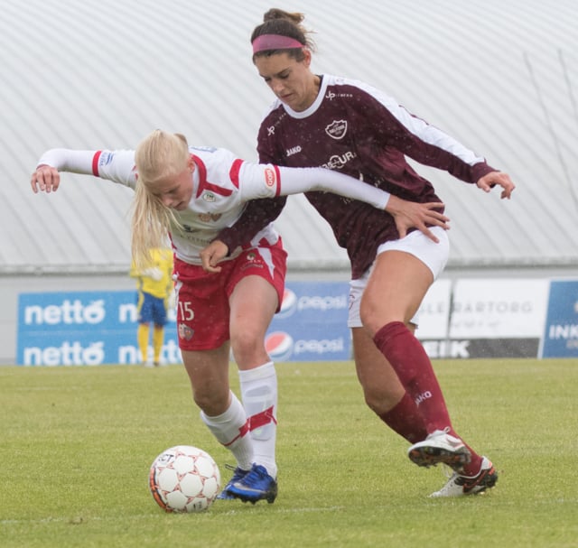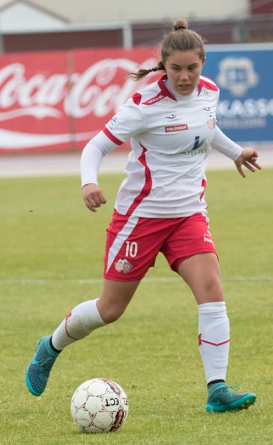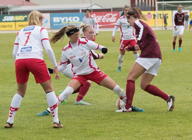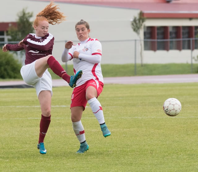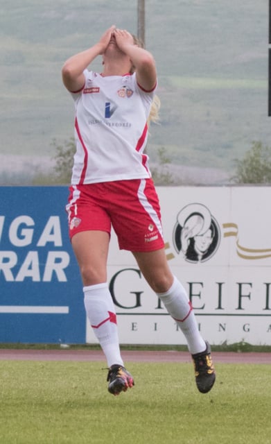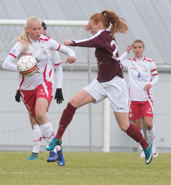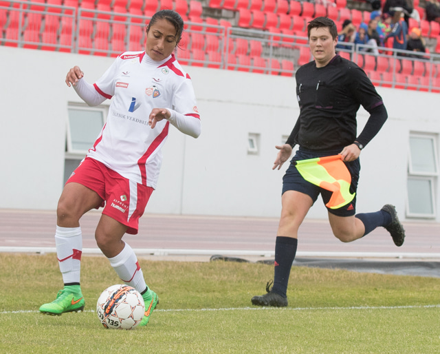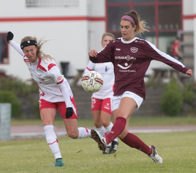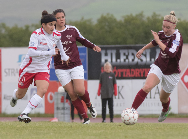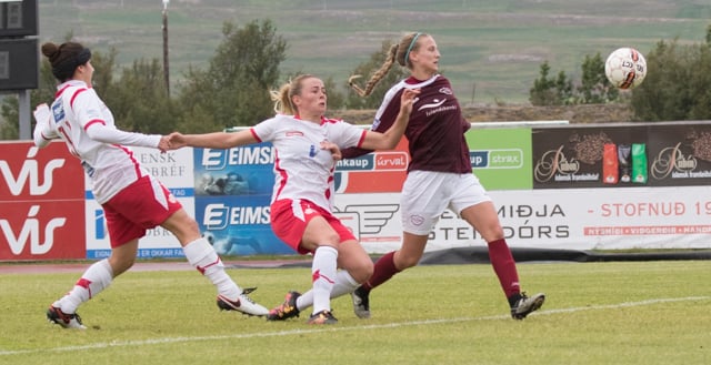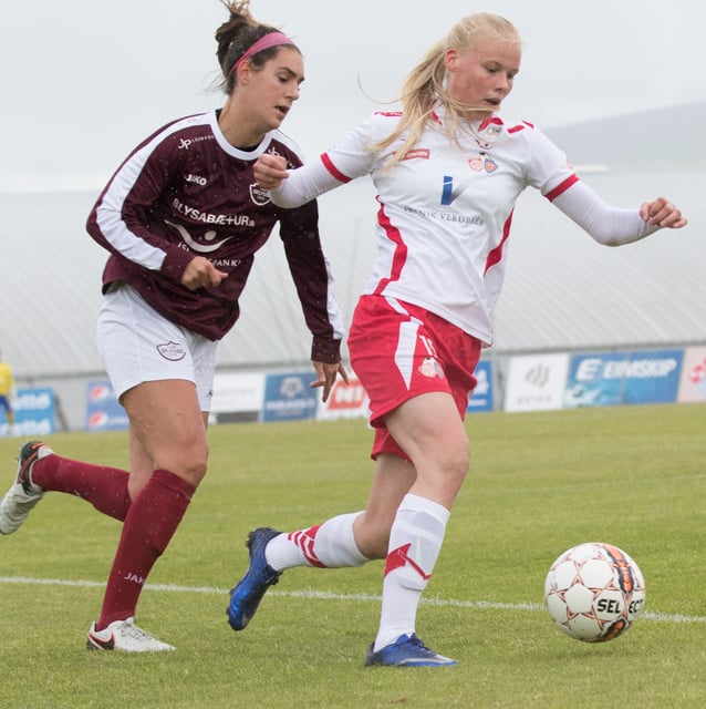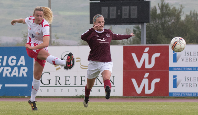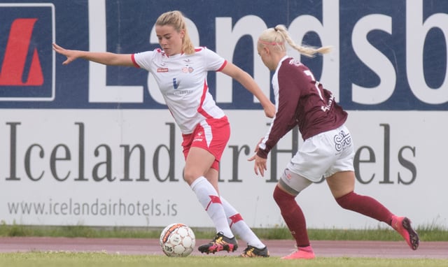 Lára Einarsdóttir með fyrirgjöf á Söndru Mayor sem rétt nær að koma tánni í boltann. Það er þó ekki nóg til að stýra honum á markið