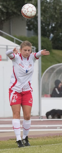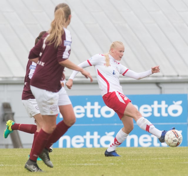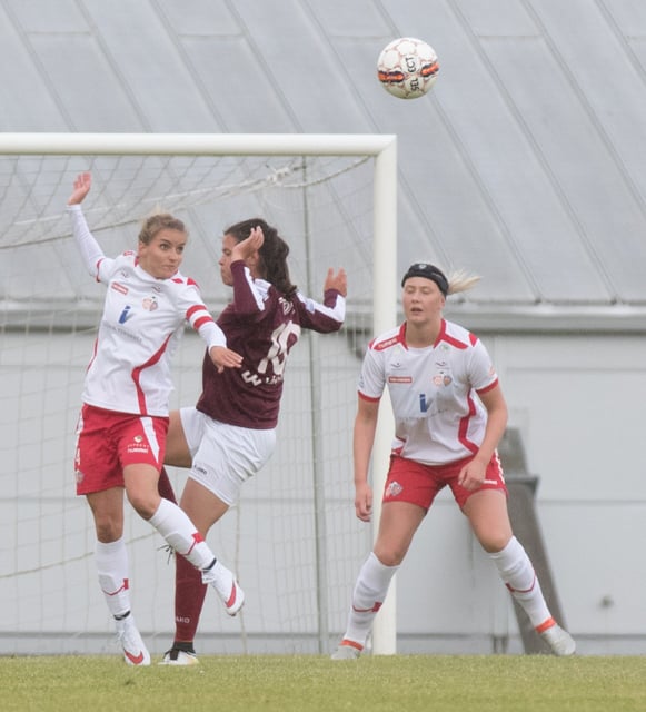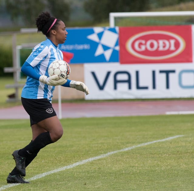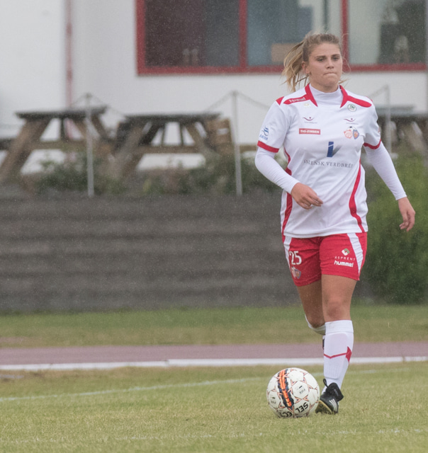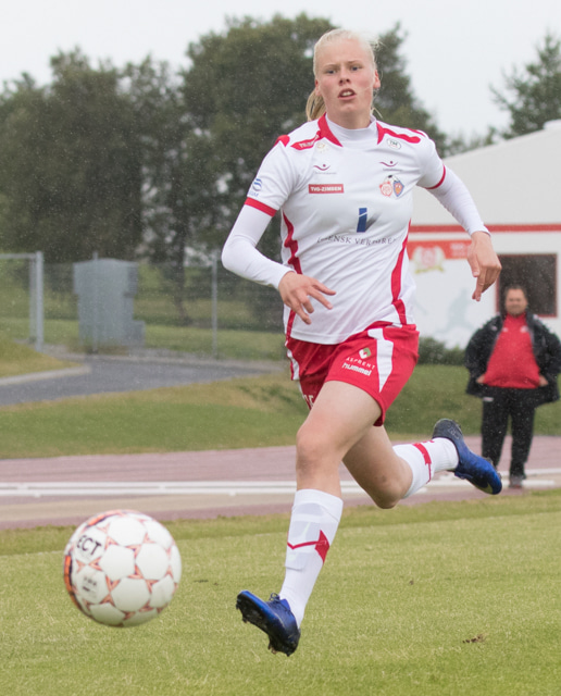 Lillý Rut með lélega sendingu þvert fyrir völlinn sem Lauren Hughes er nálægt því að komast inn í. Karen Nóa gerir hinsvegar vel og nær boltanum