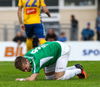 Skeiðarinn Arnór Sveinn Aðalsteinsson liggur meiddur á vellinum. Verið að veita honum aðhlynningu.