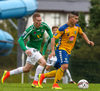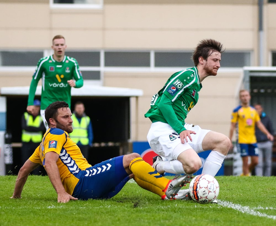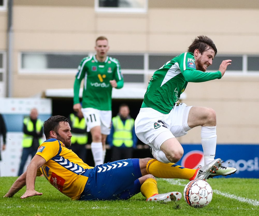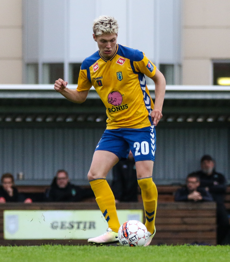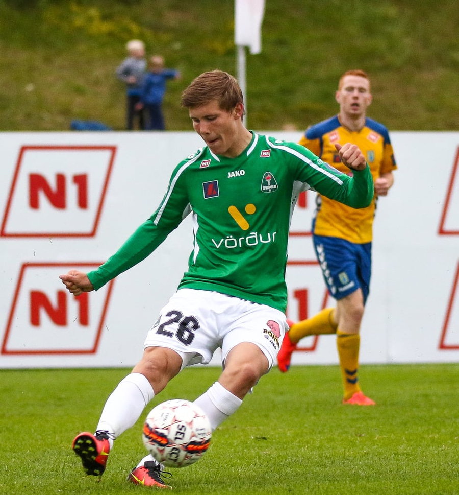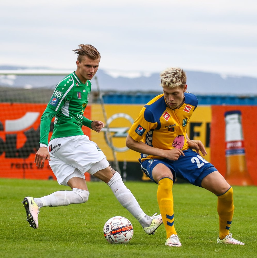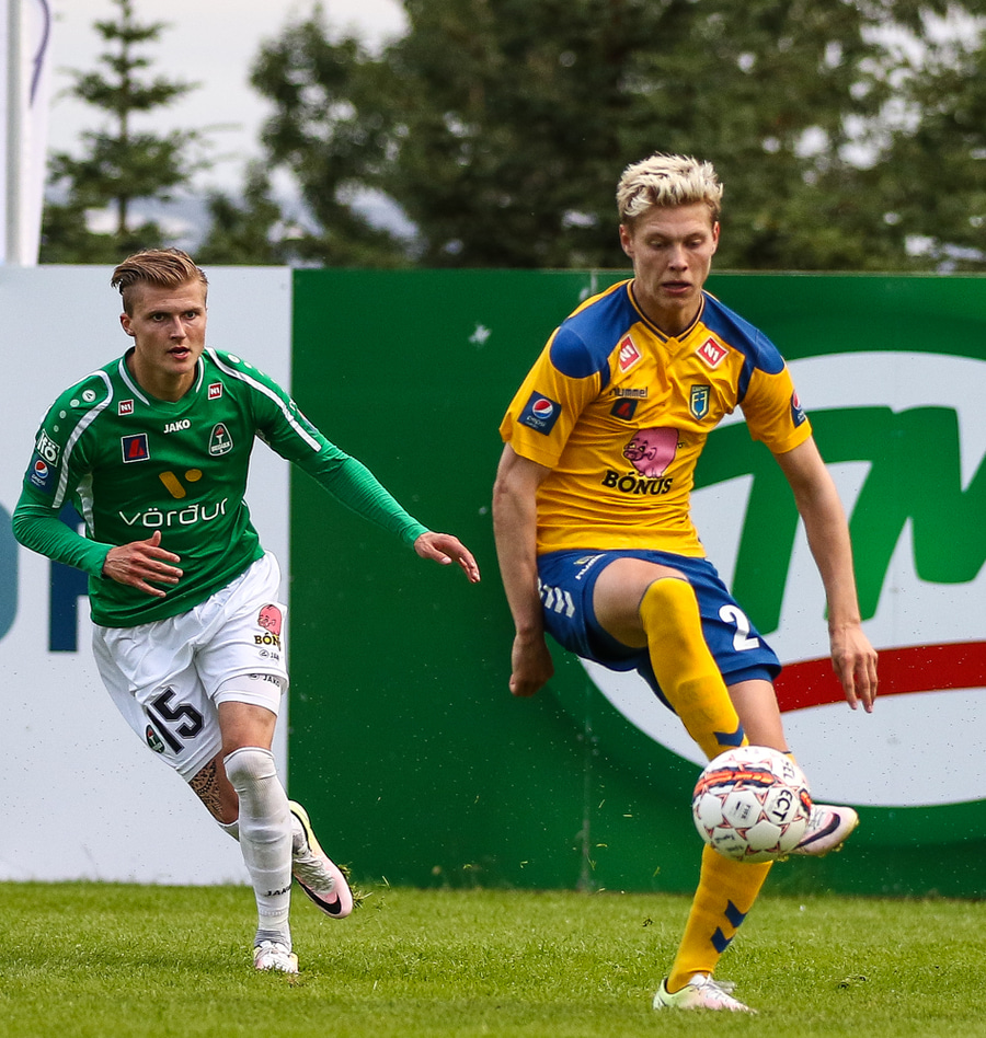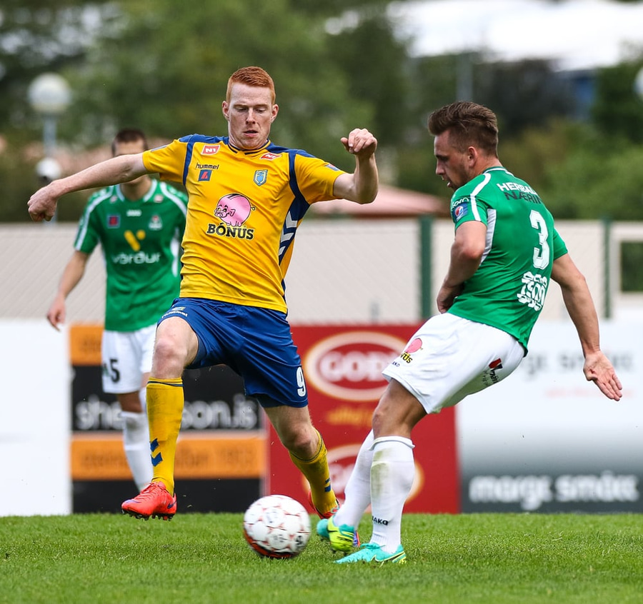 Arnþór Ari Atlason fékk stungusendingu frá Gísla Eyjólfs en flaggaður rangstæður.
