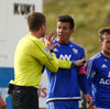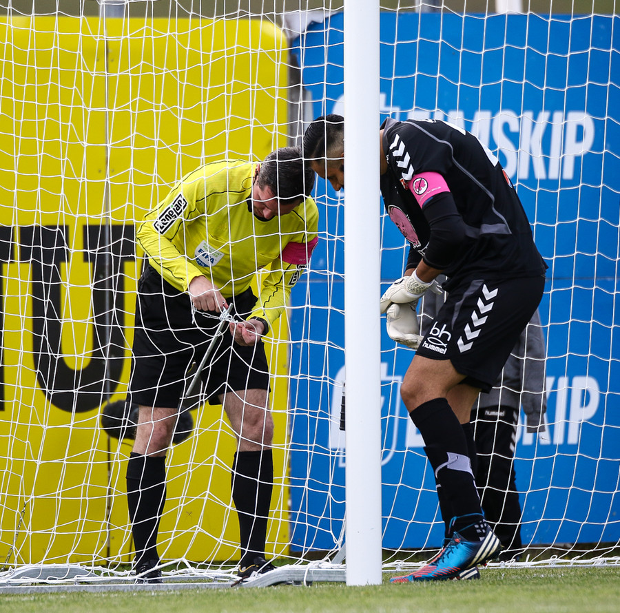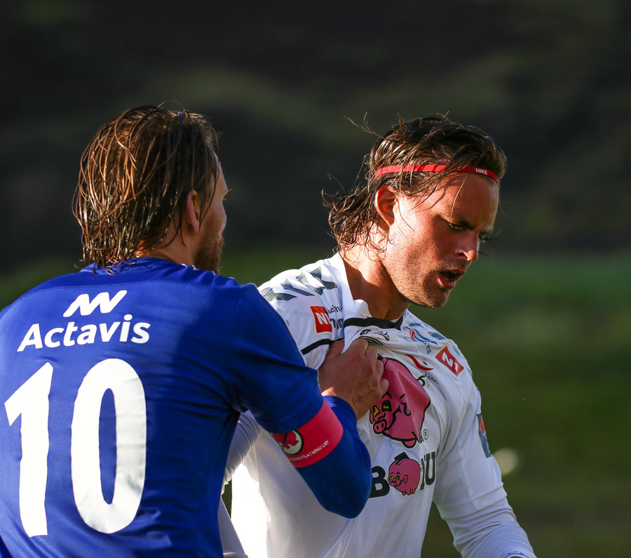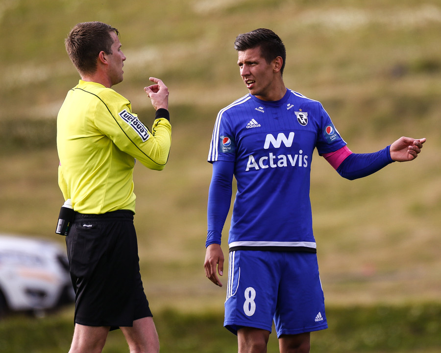 Kristján Flóki brýtur á Mees. Menn ekki sáttir en Vilhjálmur reynir að róa alla niður.