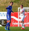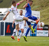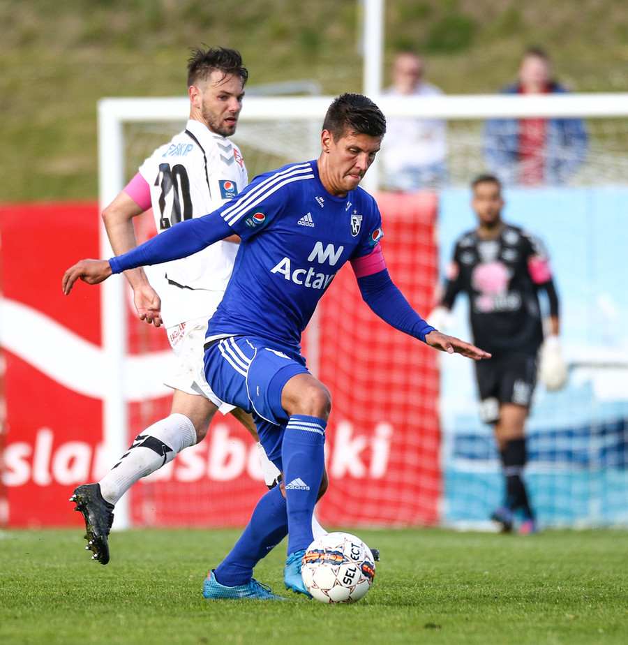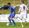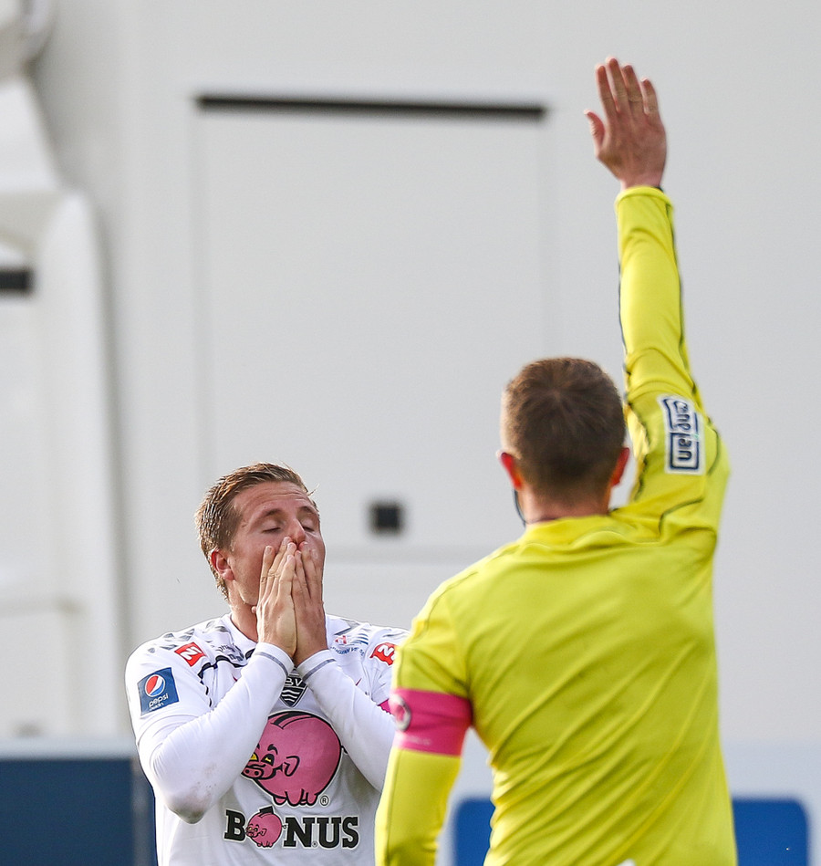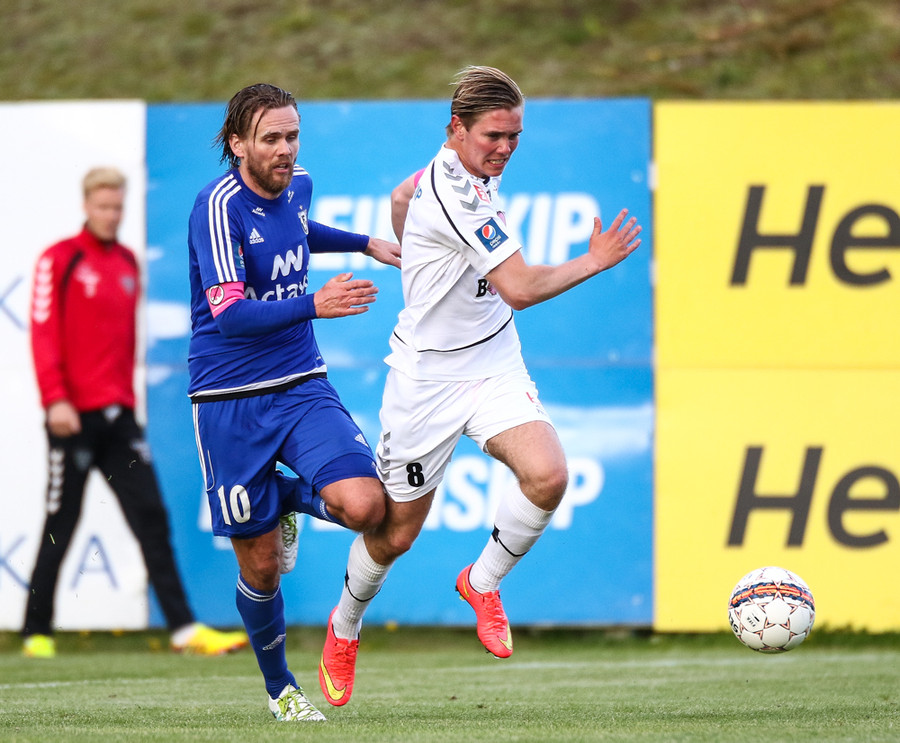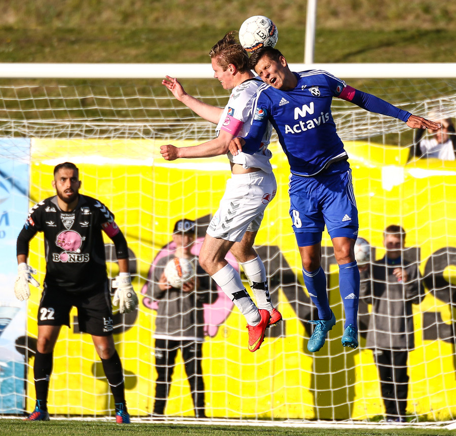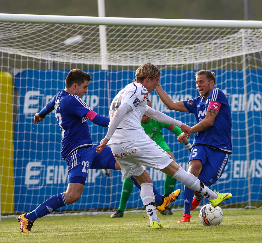 Mikkel og Aron spila vel sín á milli en flaggað er á Mikkel. Gat nú ekki séð að hann væri rangstæður þarna.