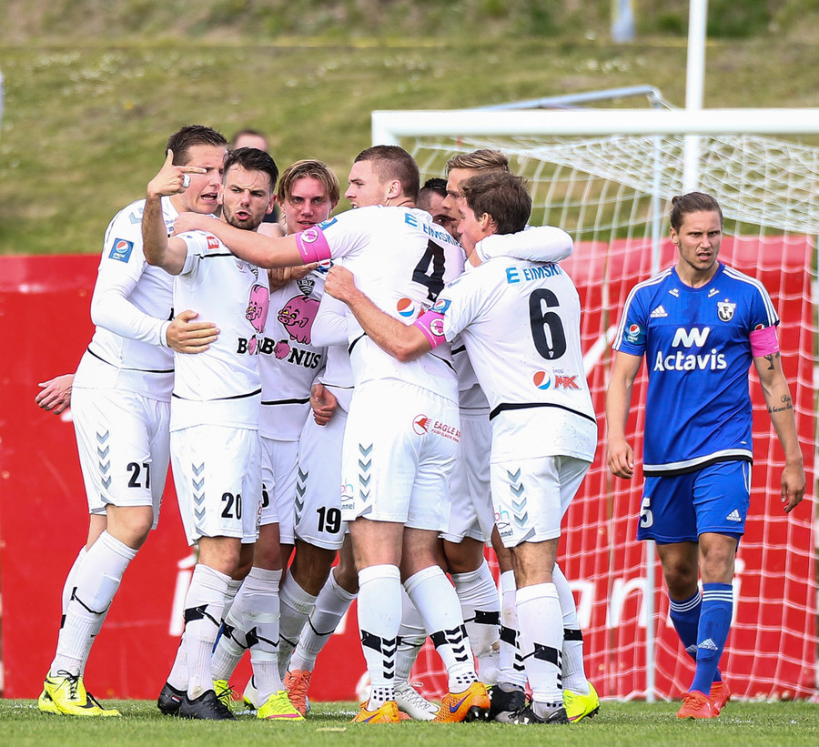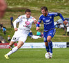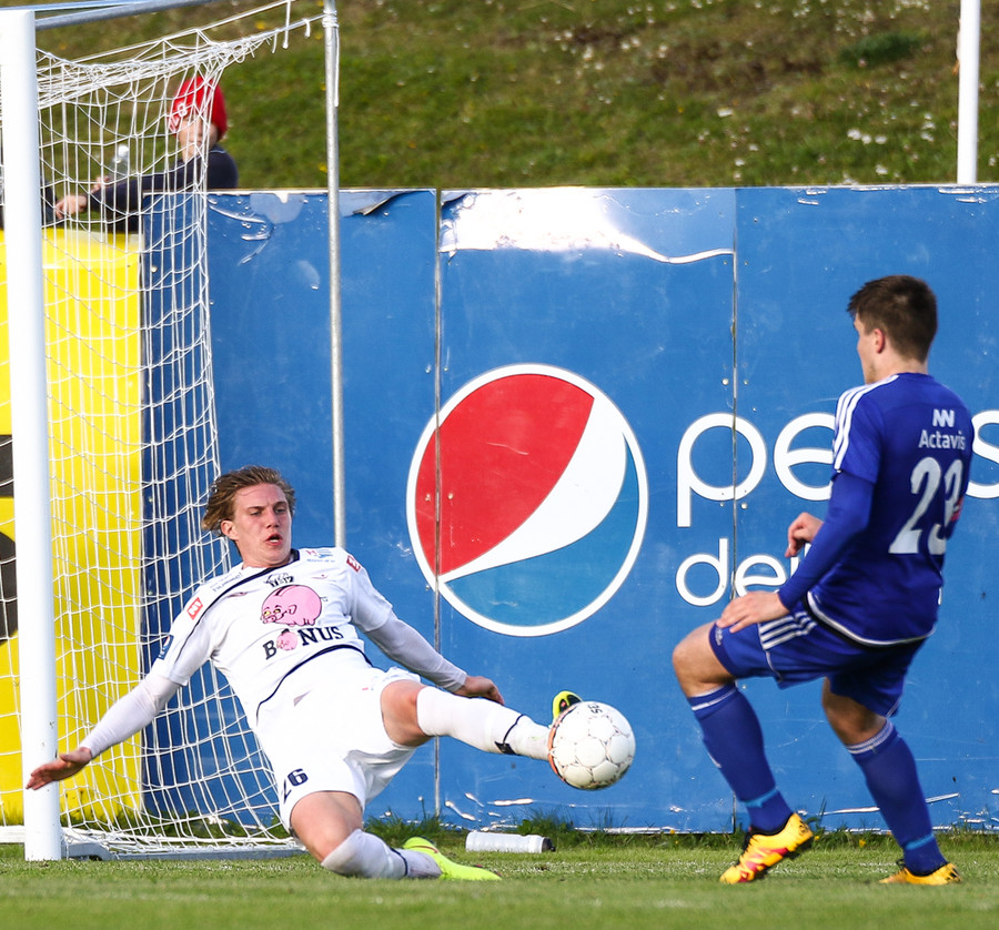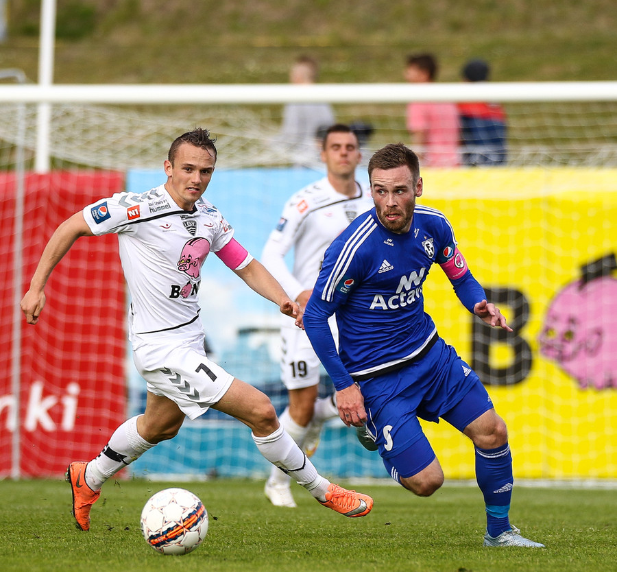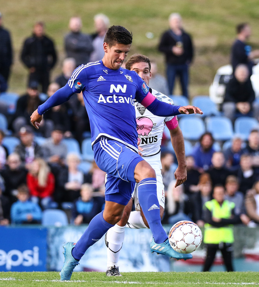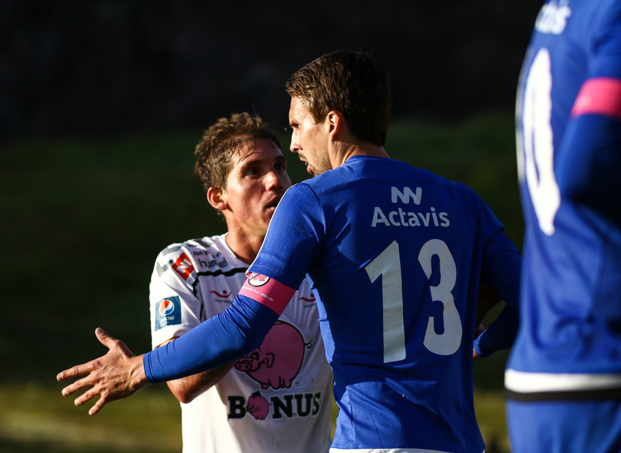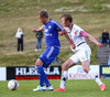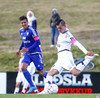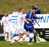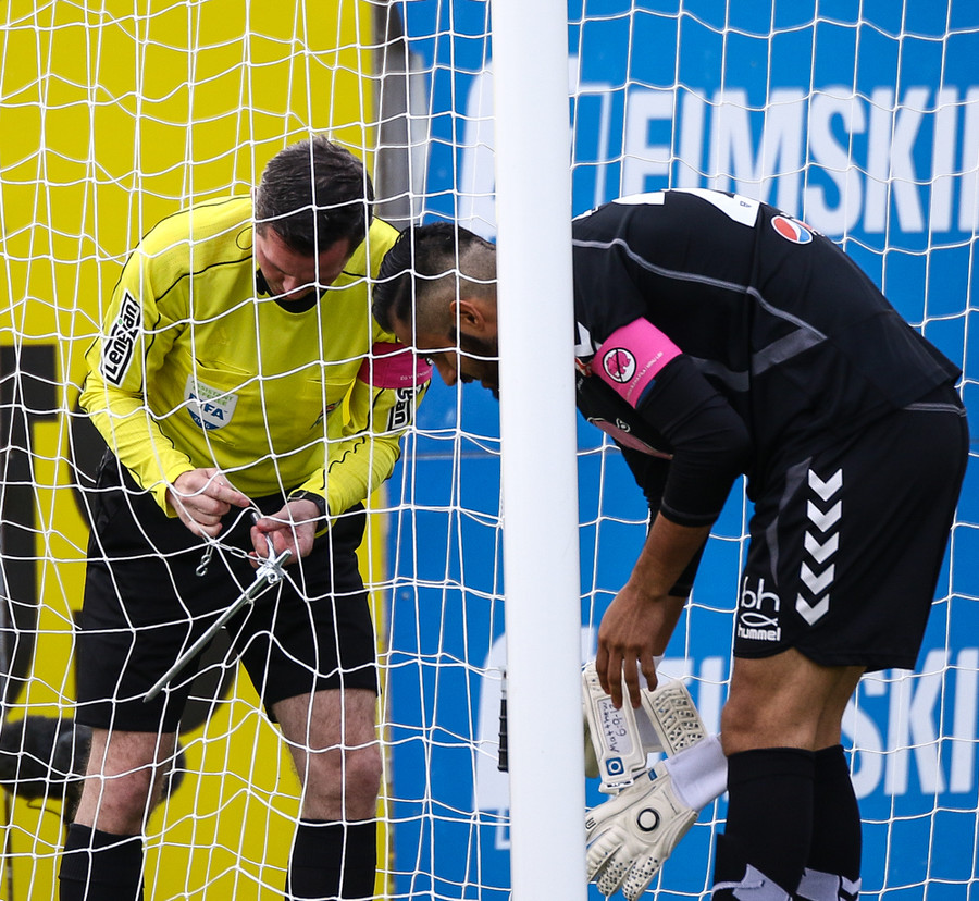 Mikkel og Aron spila vel sín á milli en flaggað er á Mikkel. Gat nú ekki séð að hann væri rangstæður þarna.