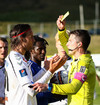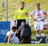 Derby Carrillo grípur aukaspyrnu frá FH en sest síðan í grasið og heldur um löppina. Hann virðist þó vera í lagi, tekur útspark og ÍBV vinnur innkast út frá þessu.