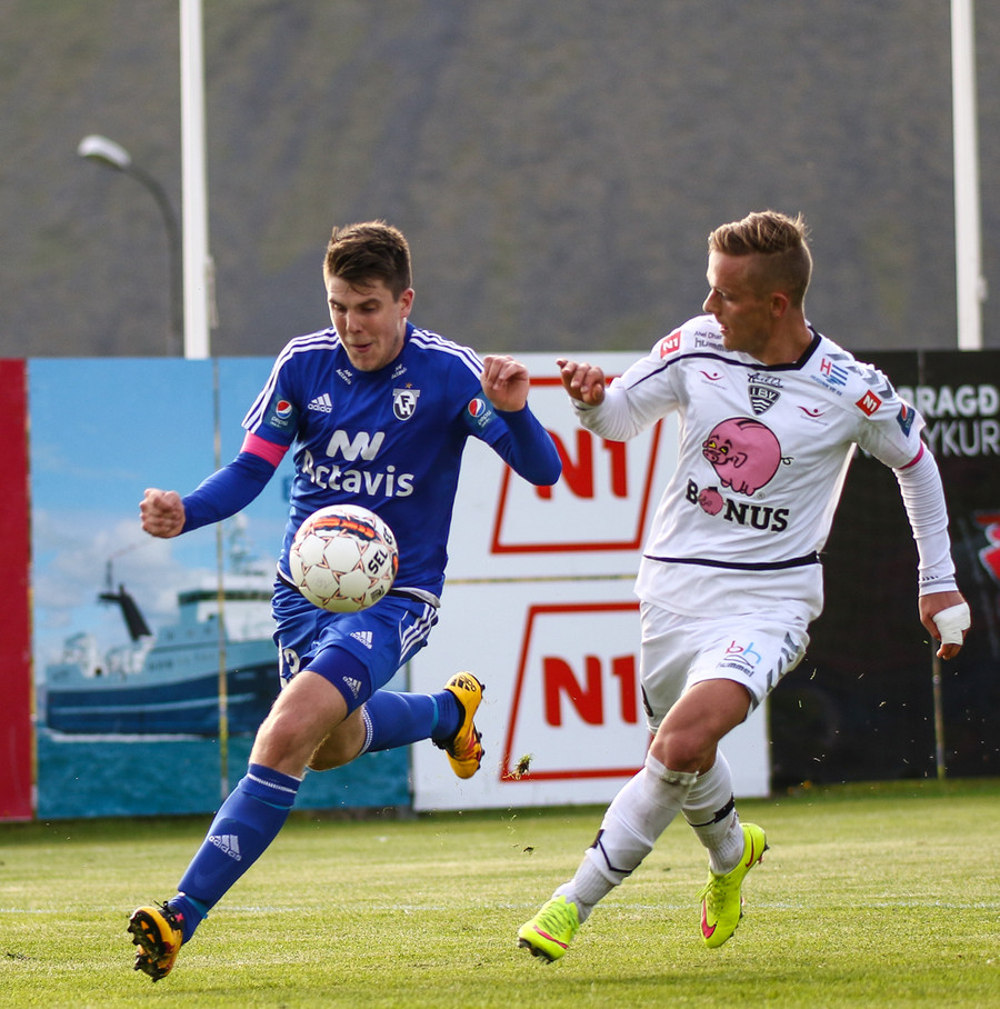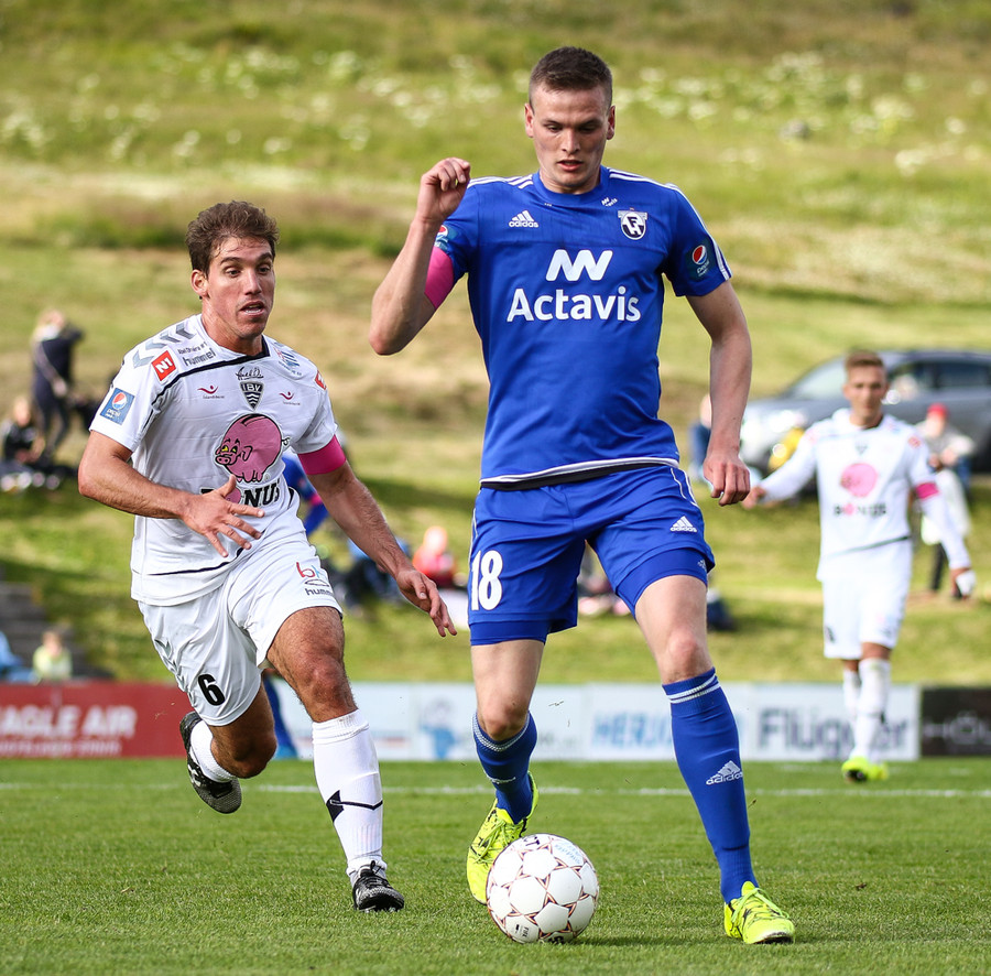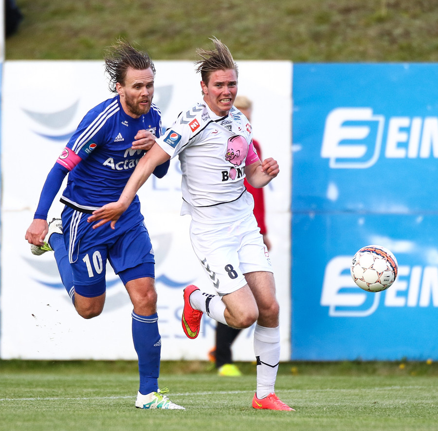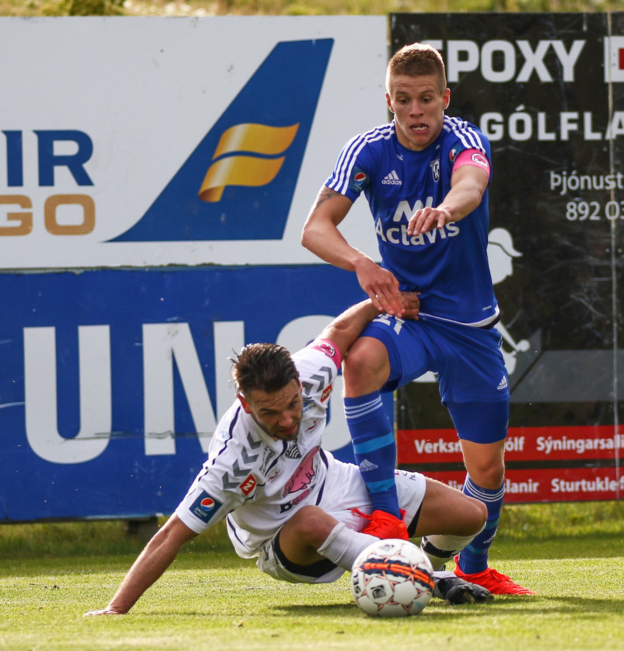 Elvar Ingi er á harðaspretti í átt að vítateig FH-inga en brýtur á varnarmanni í leiðinni og brot dæmt á Elvar.