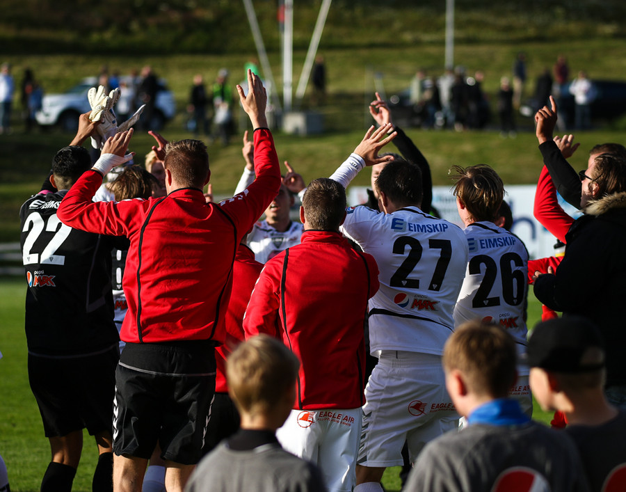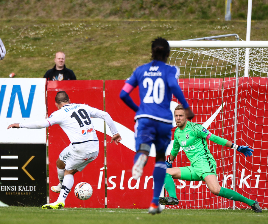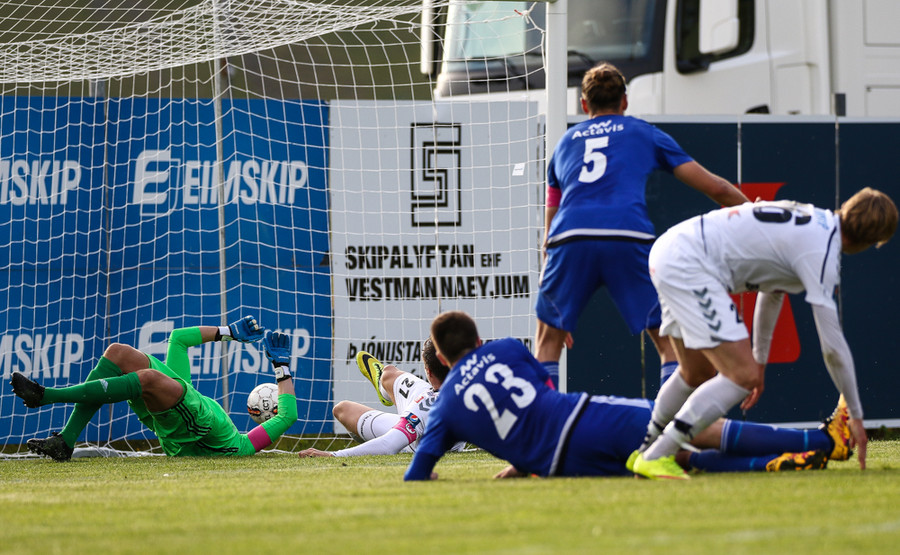 Elvar Ingi skorar fyrir Eyjamenn! En bíddu, það er búið að flagga! Frábærlega gert hjá Felix sem fær boltann úti á kanti hleypur inn á teiginn framhjá bakverðinum og lætur vaða. Gunnar ver hann beint út og Elvar setur hann í netið en líklega var hann fyrir innan og þetta því hárréttur dómur.