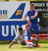 Aron fer í Böðvar sem fer niður heldur auðveldlega. FH á aukaspyrnu á góðum stað.