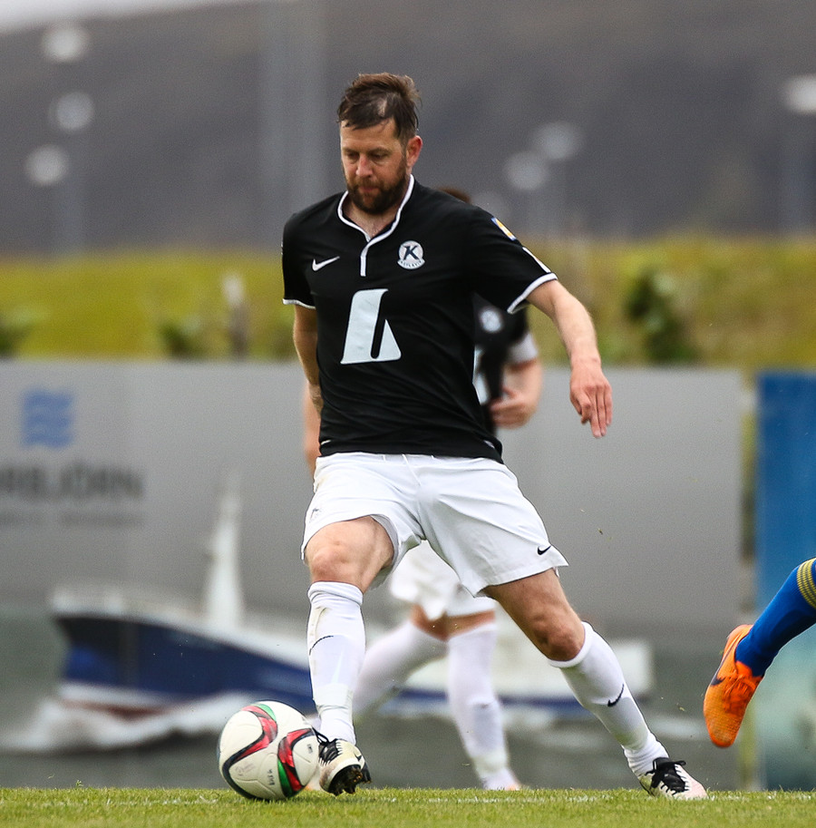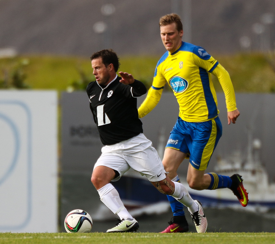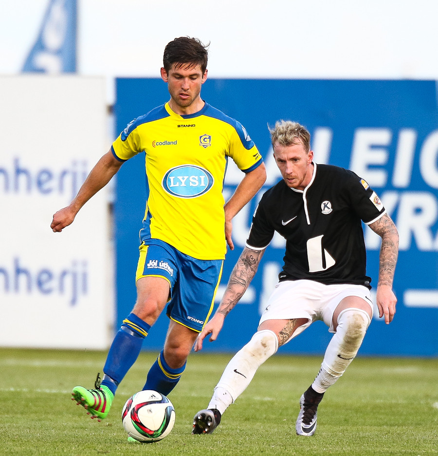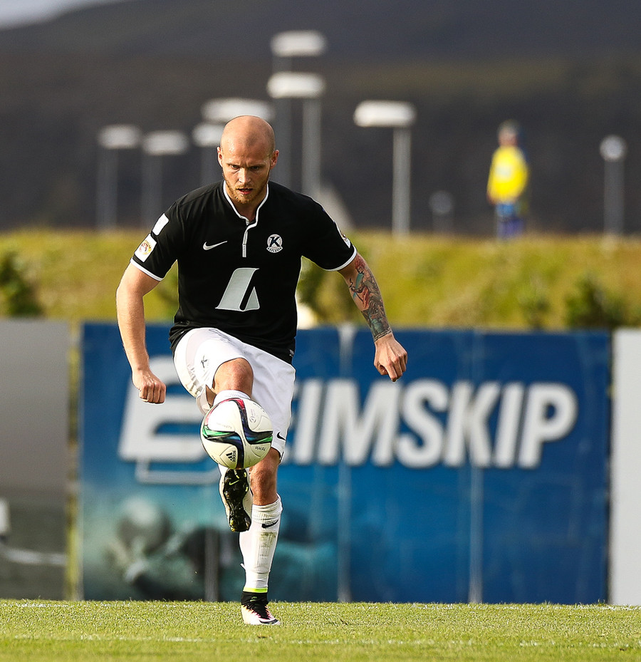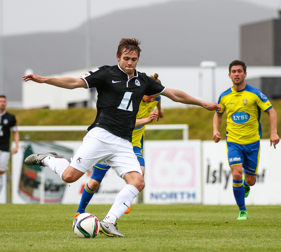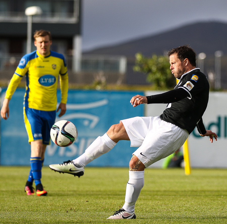 Keflvíkingar sækja og berst boltinn á Stuart Carswell sem á skot að marki en það fer í Björn Bryde. Þessi virtist vera á leiðinni inn. Fyrsta færi leiksins.