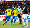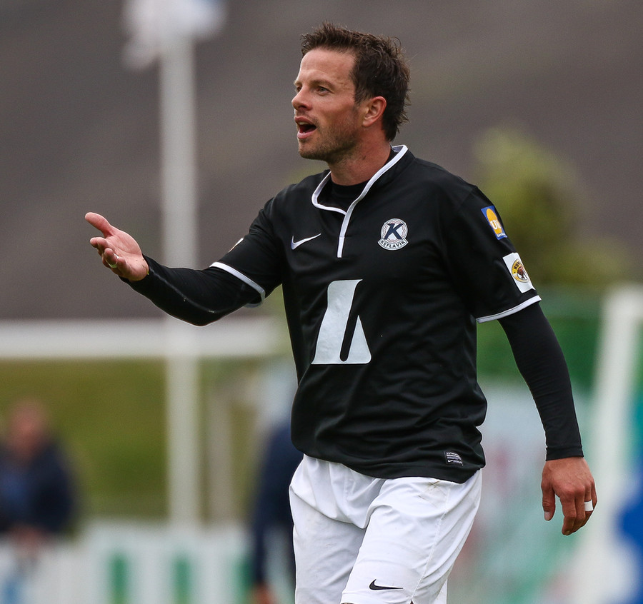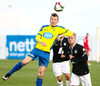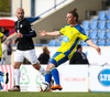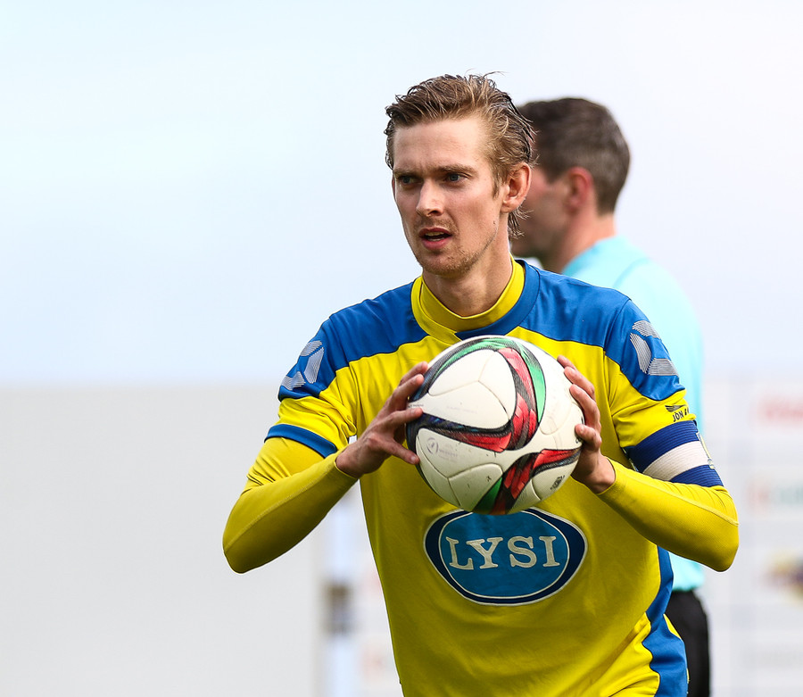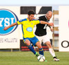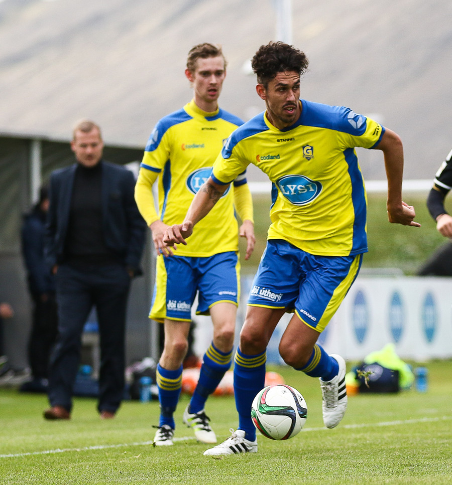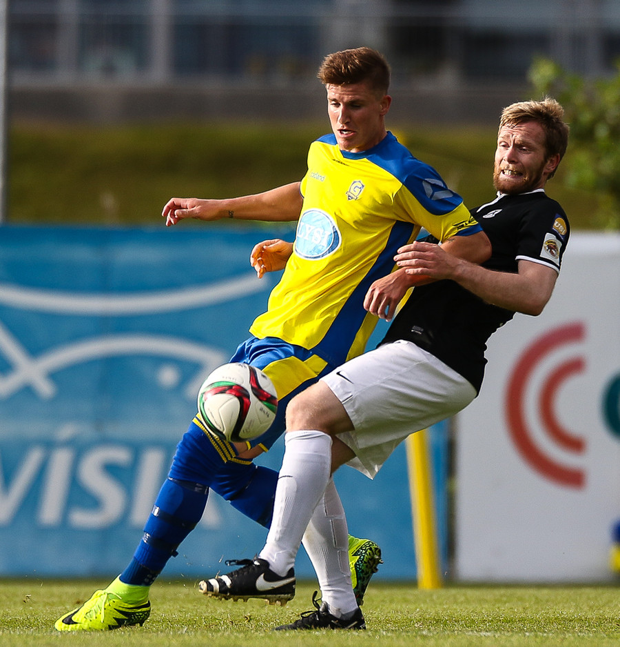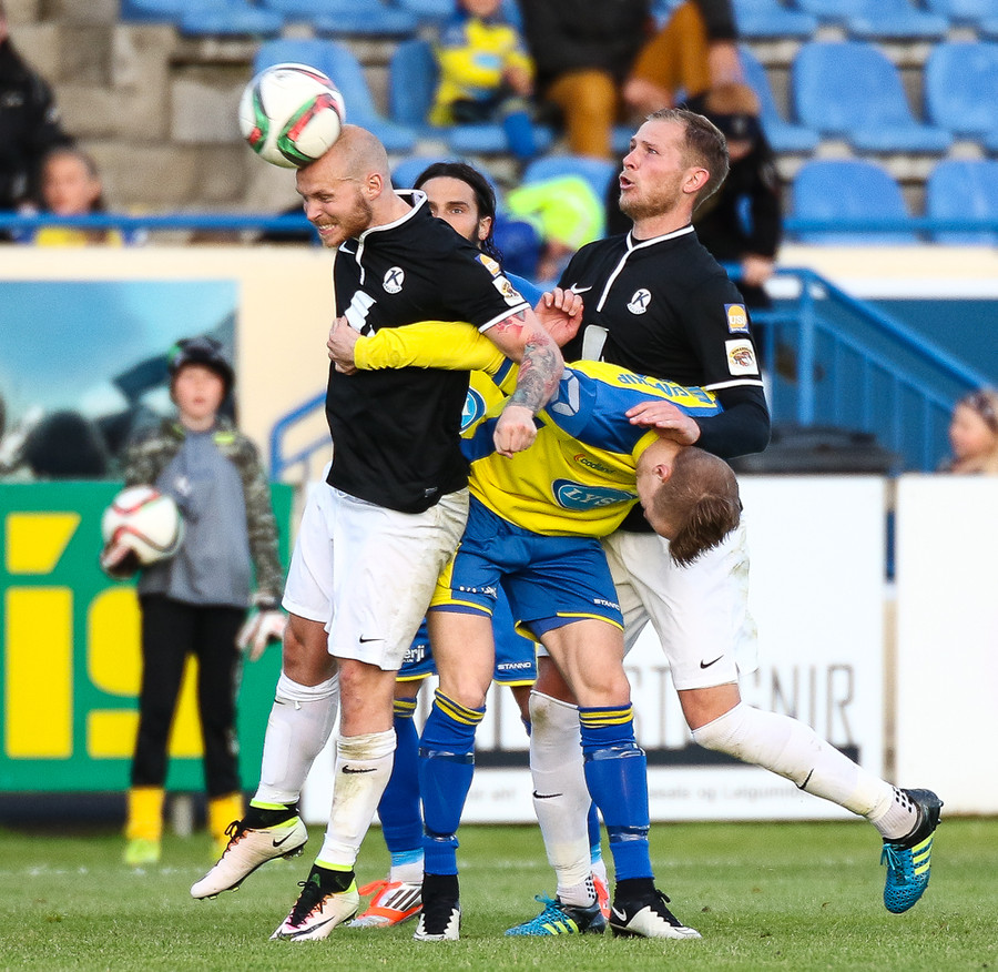 Keflvíkingar sækja og berst boltinn á Stuart Carswell sem á skot að marki en það fer í Björn Bryde. Þessi virtist vera á leiðinni inn. Fyrsta færi leiksins.