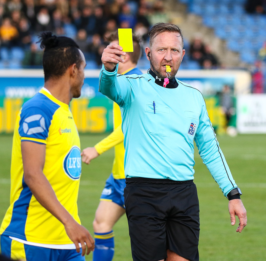 Peysutog á miðjum vellinum. Alltaf spjald og Einar veit það.