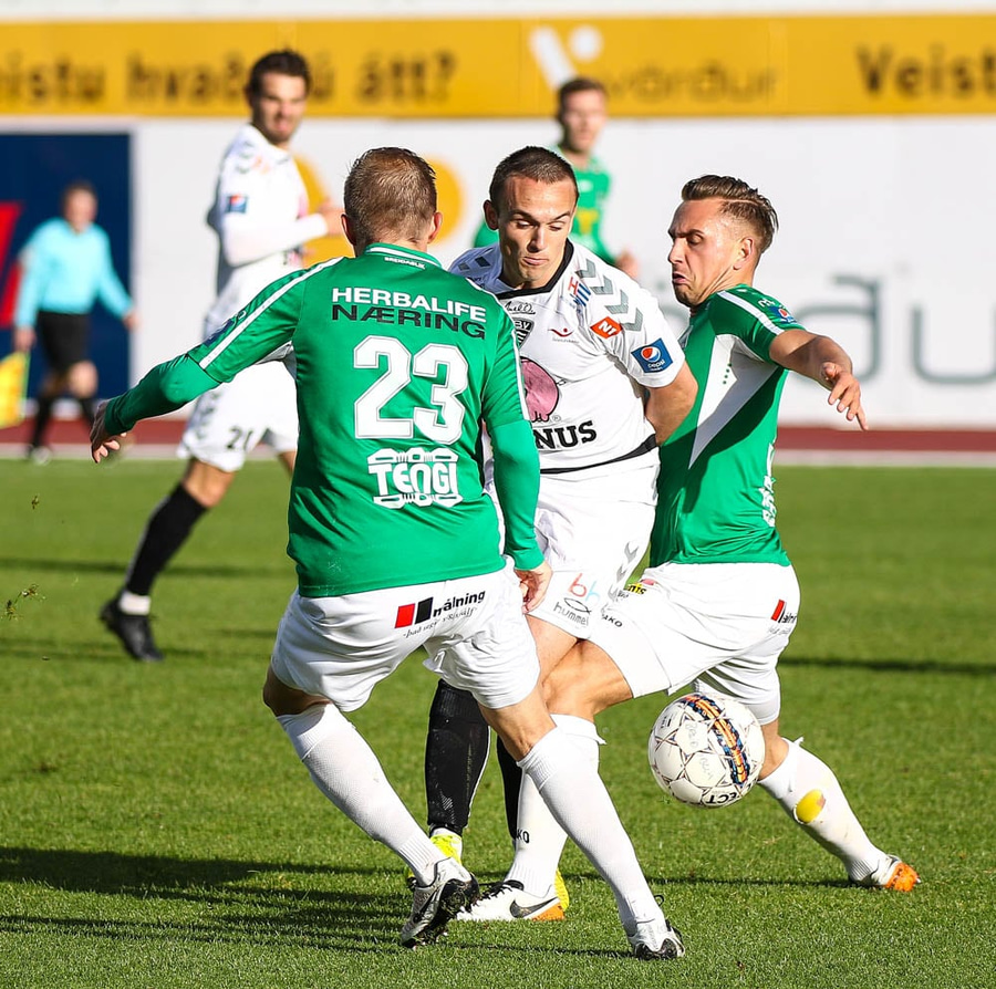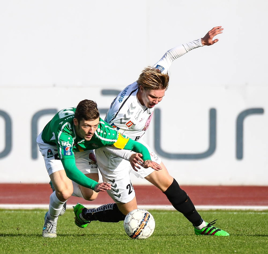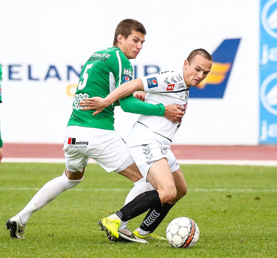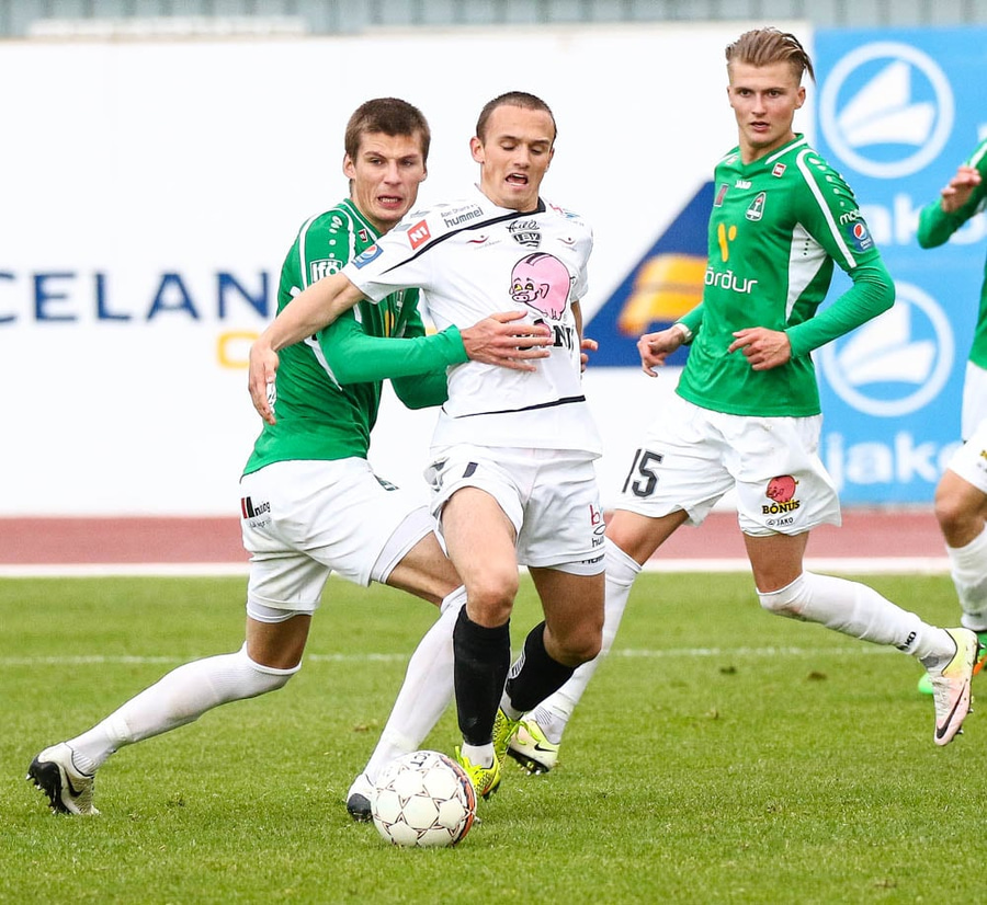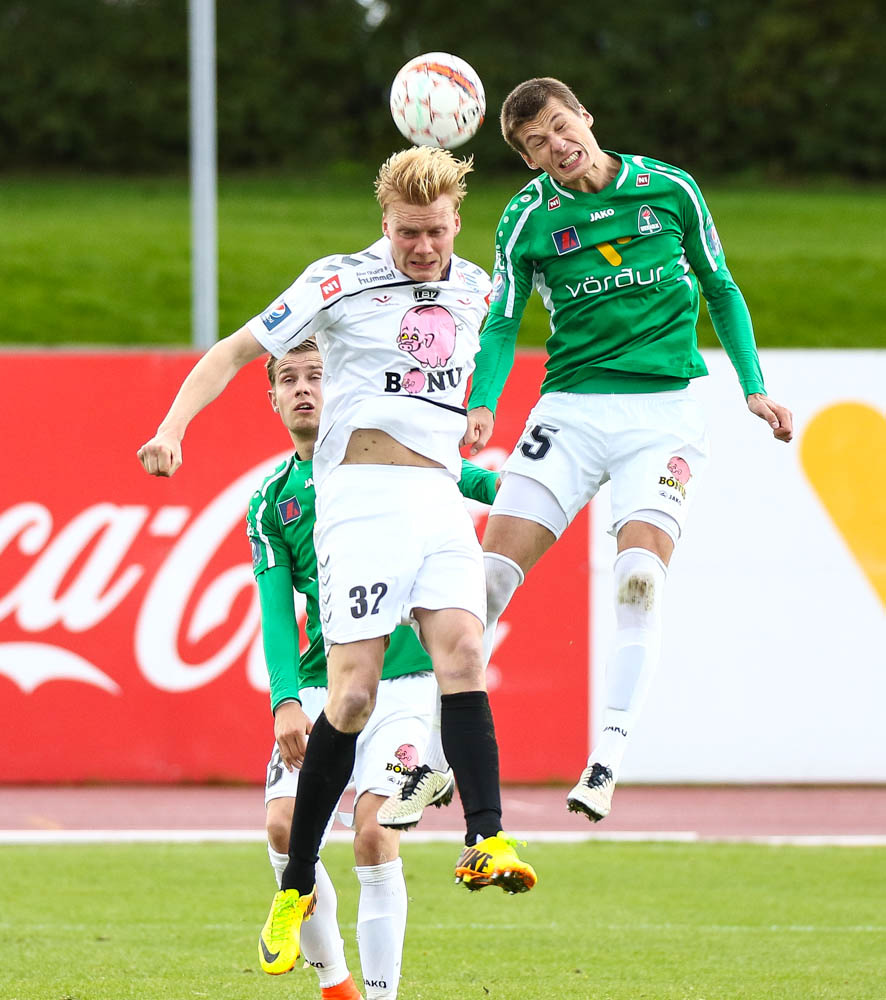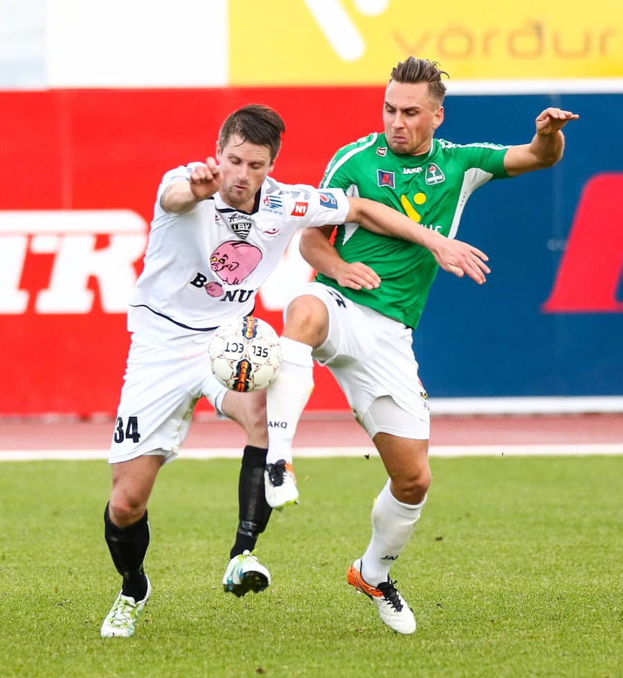 Alltof seinn í tæklingu á Árna Vilhjálms á hægri kantinum.