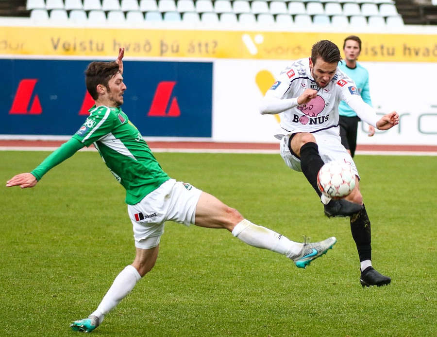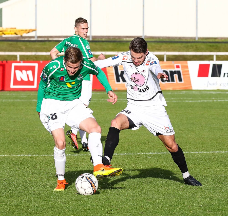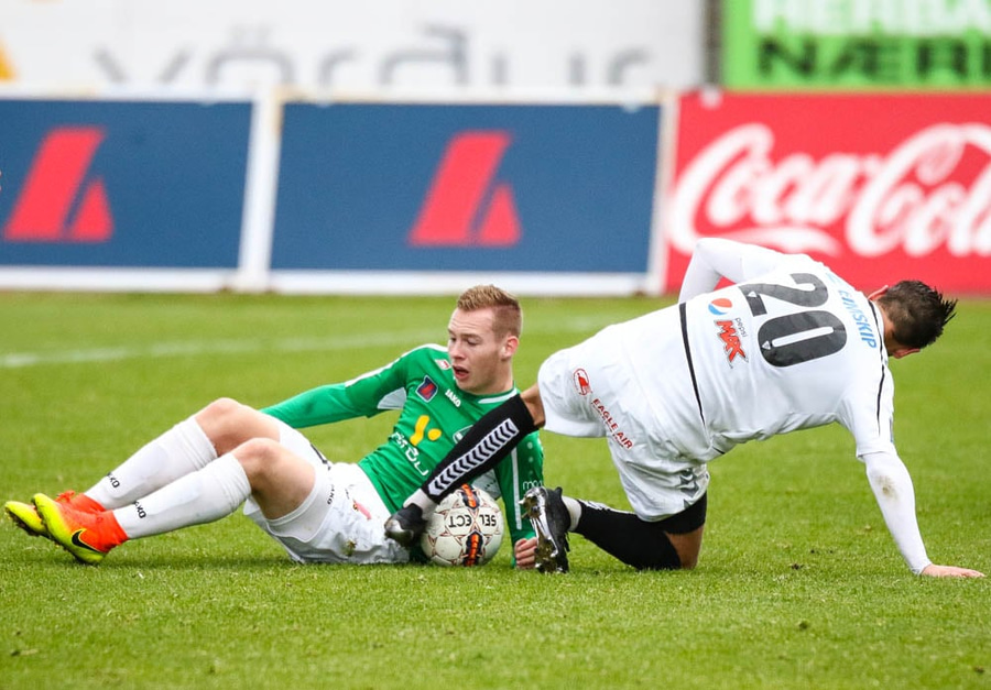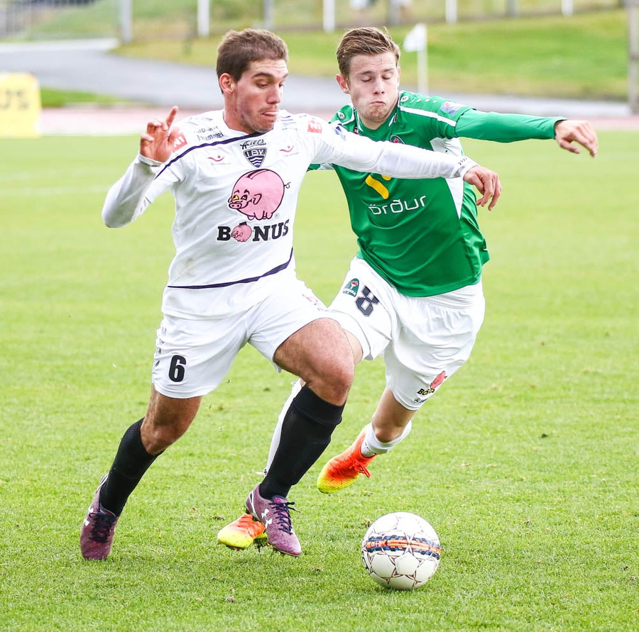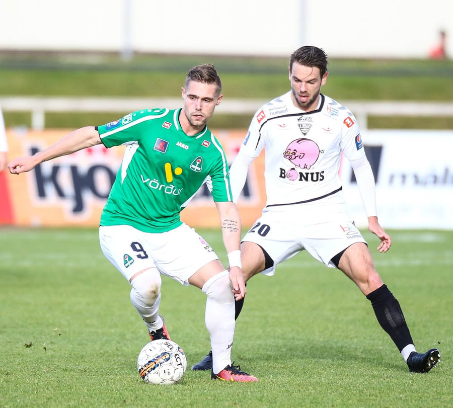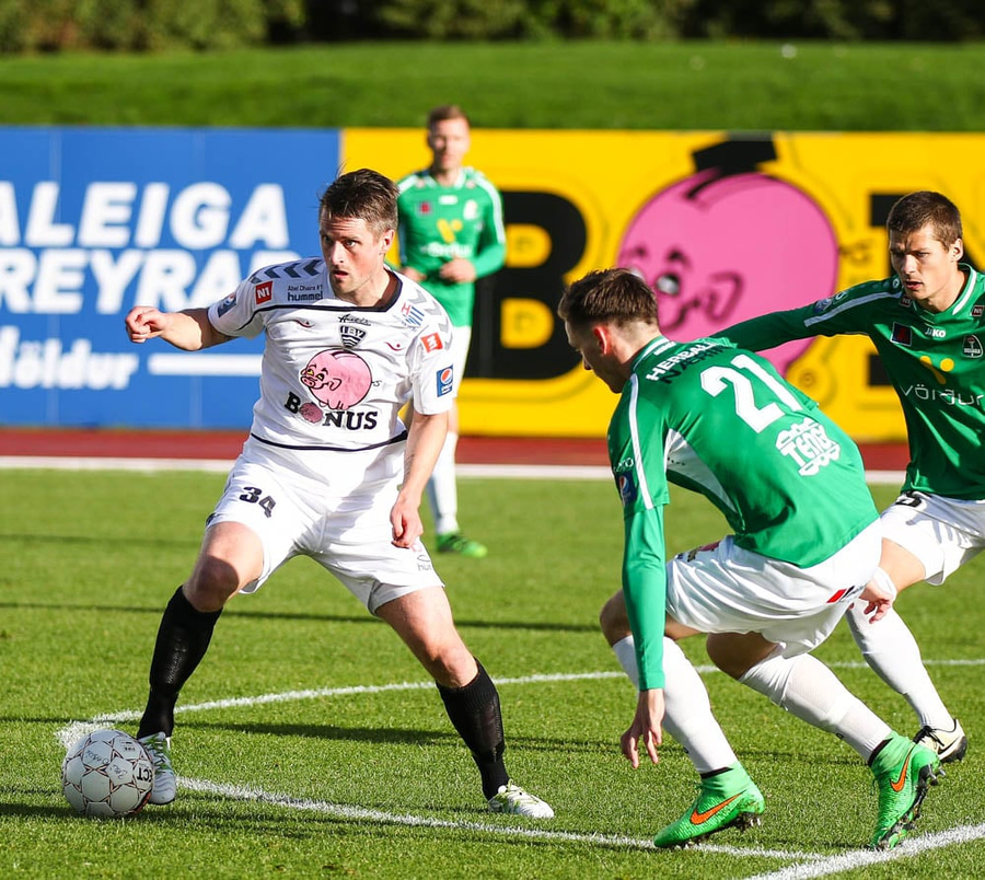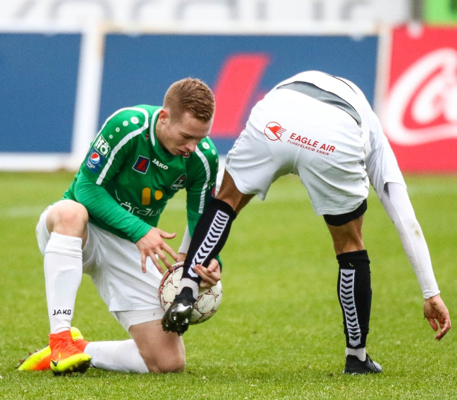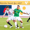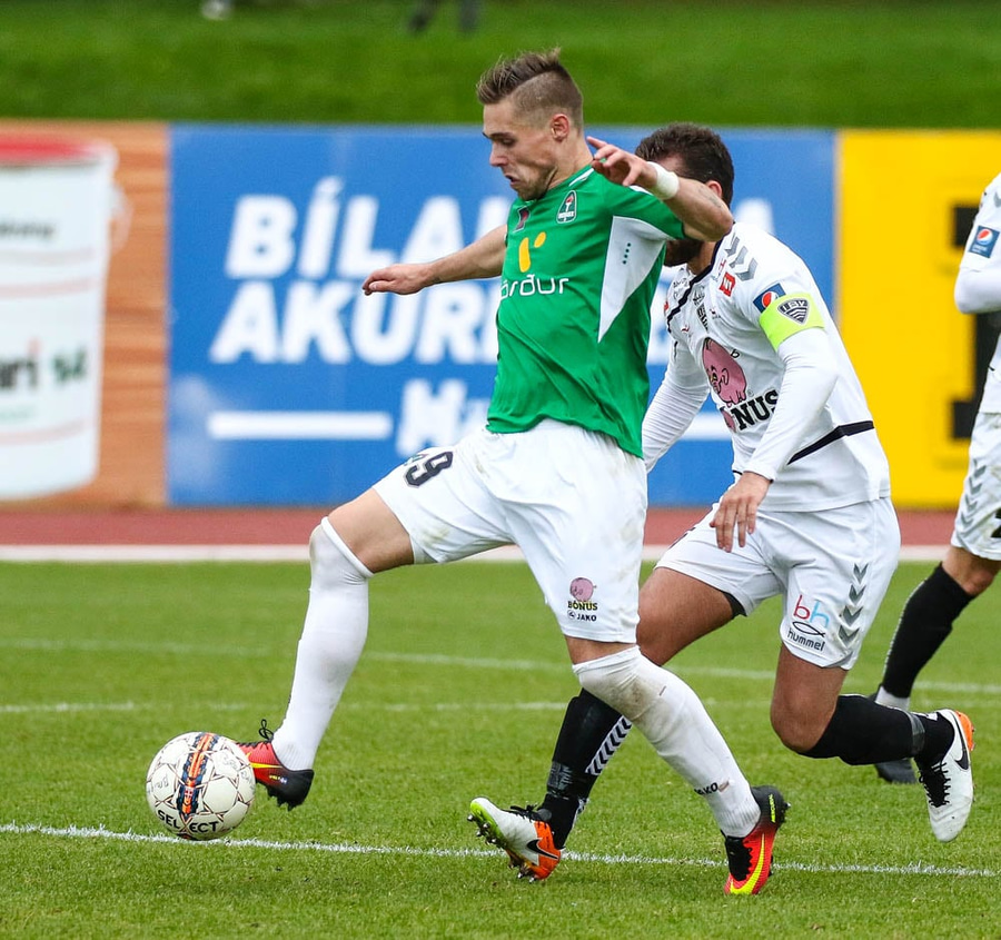 Alltof seinn í tæklingu á Árna Vilhjálms á hægri kantinum.