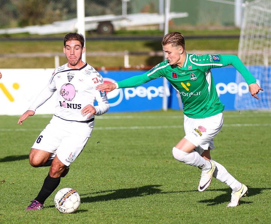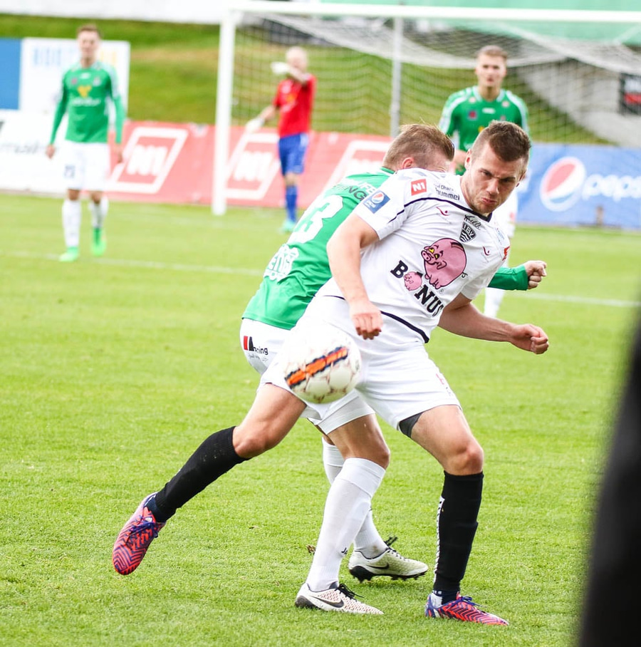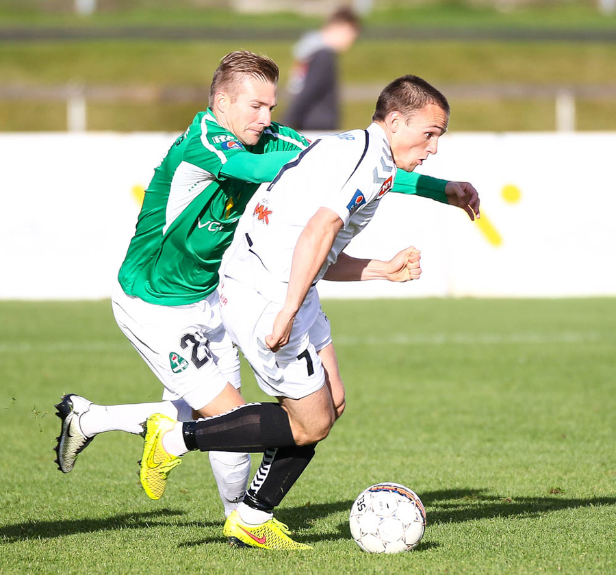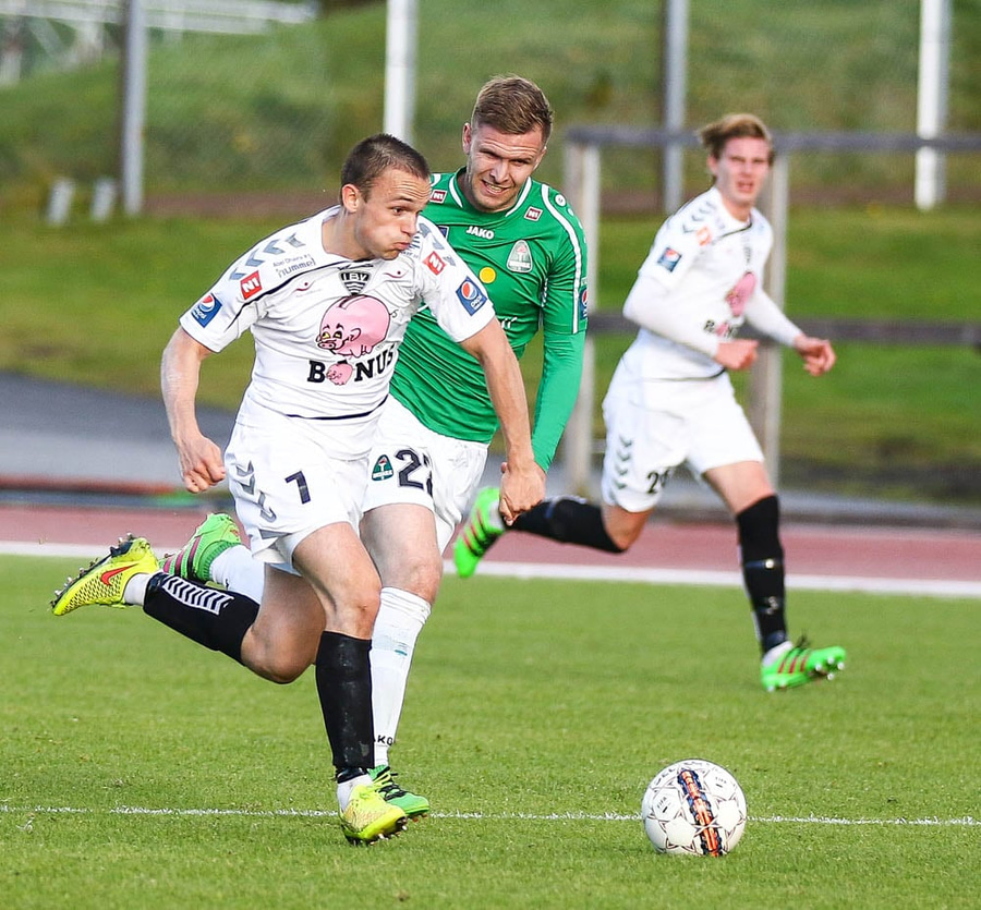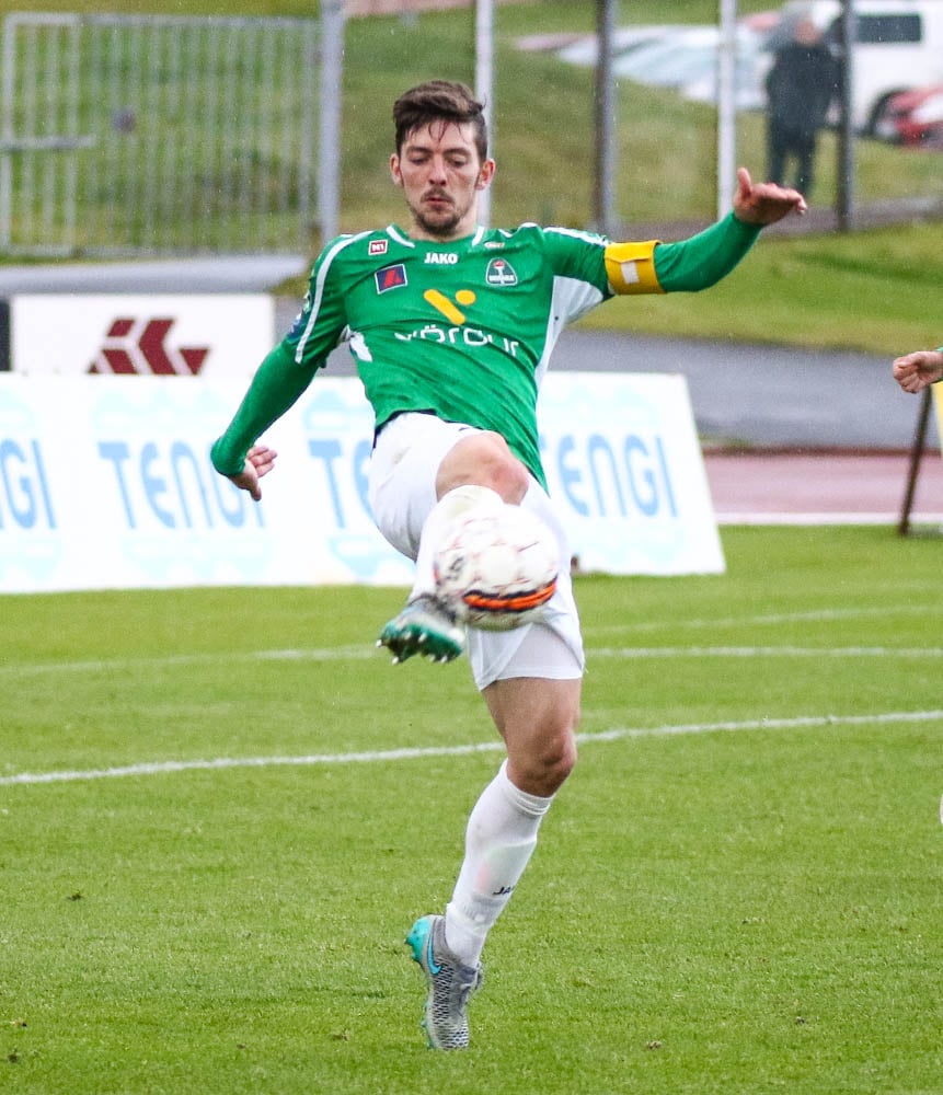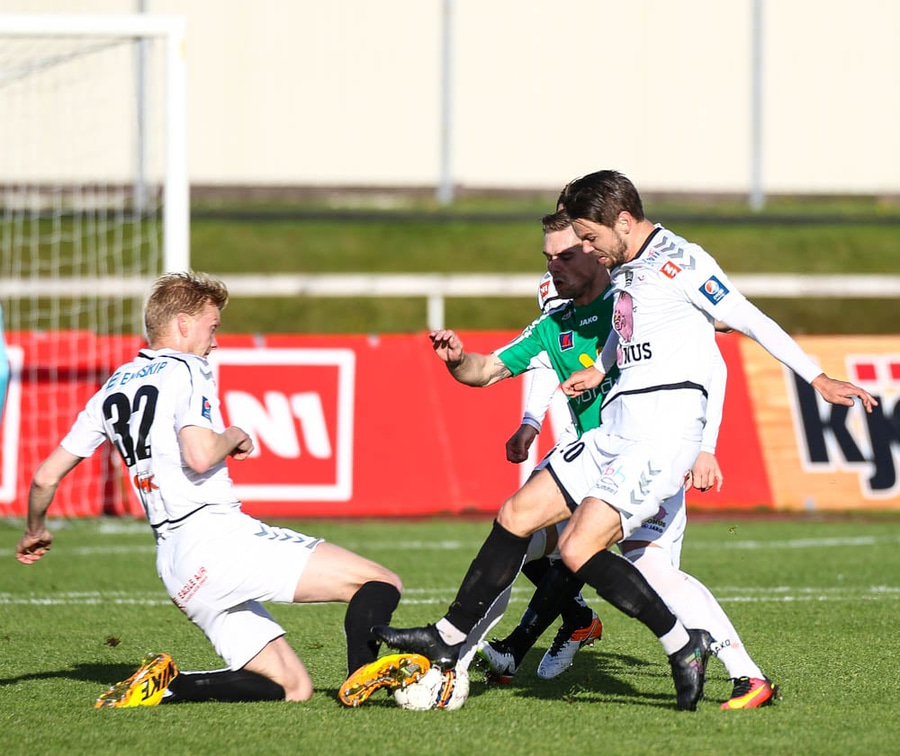 Alltof seinn í tæklingu á Árna Vilhjálms á hægri kantinum.
