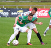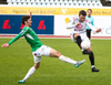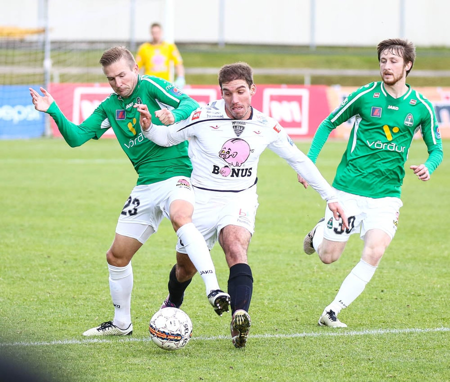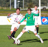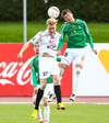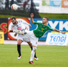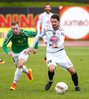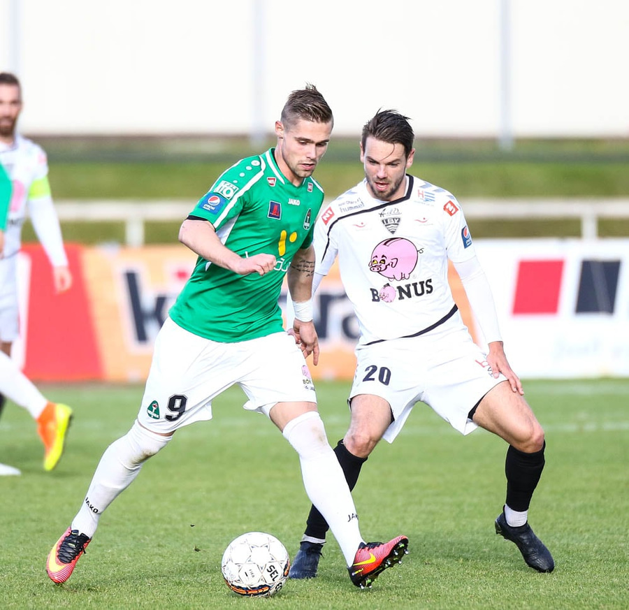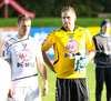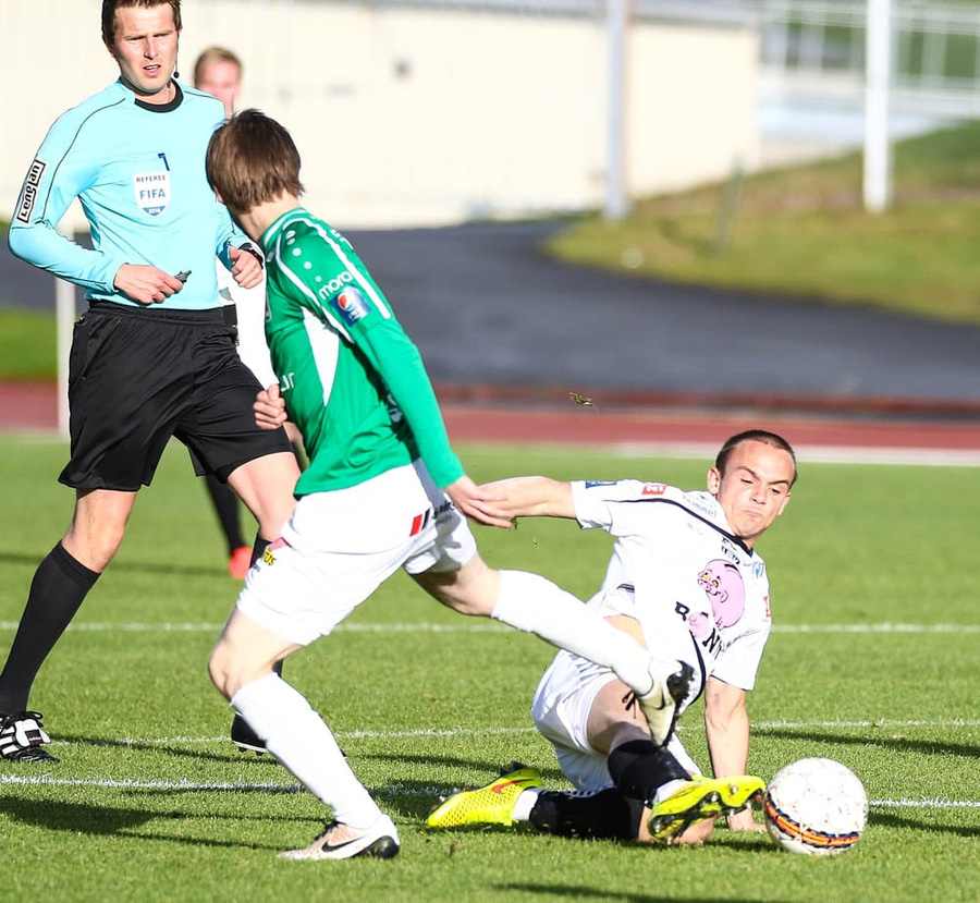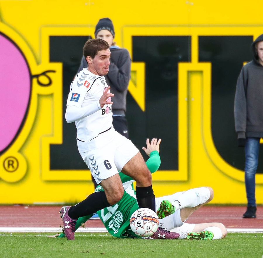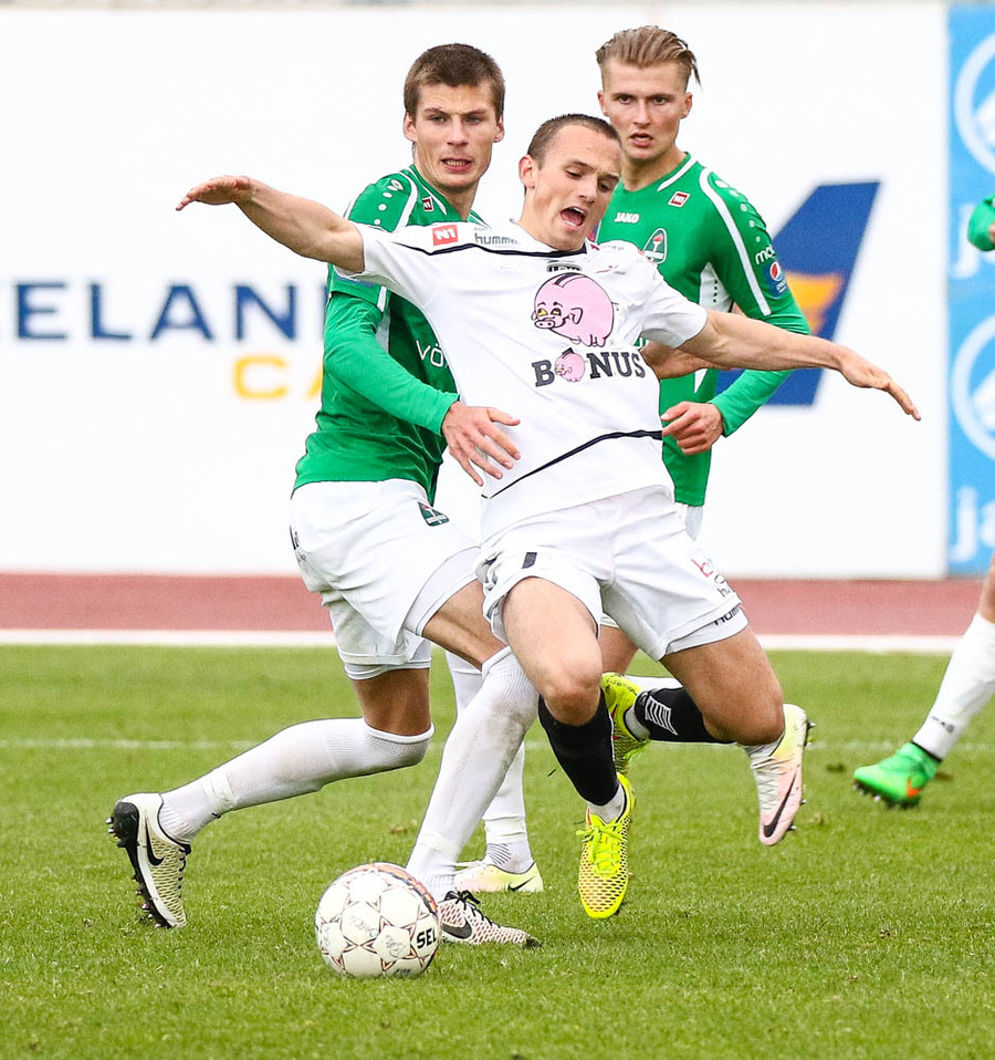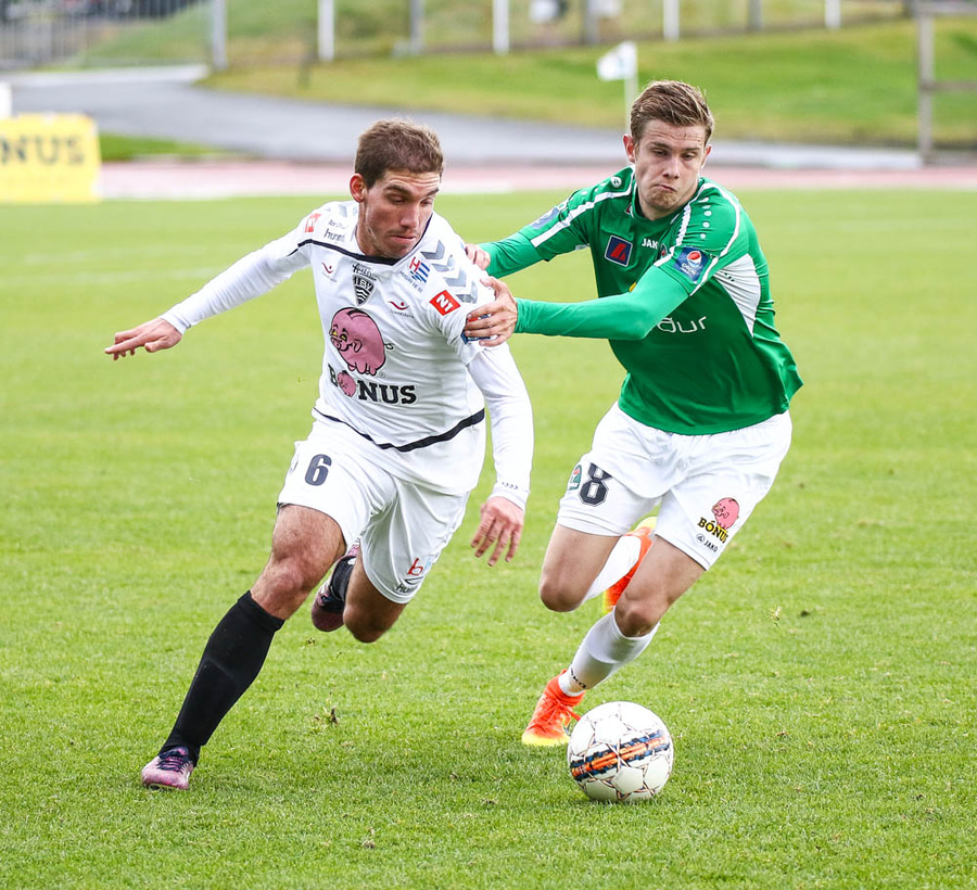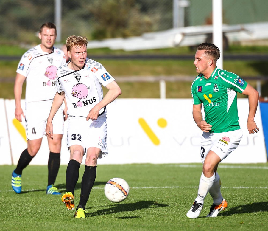 Alltof seinn í tæklingu á Árna Vilhjálms á hægri kantinum.
