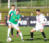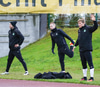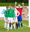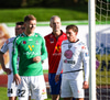 Liðin eru að hita upp á Kópavogsvelli. Búið að rigna í dag svo völlurinn er blautur. Núna skín sólin og leikmenn hita upp með regnboga í bakgrunni.