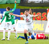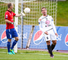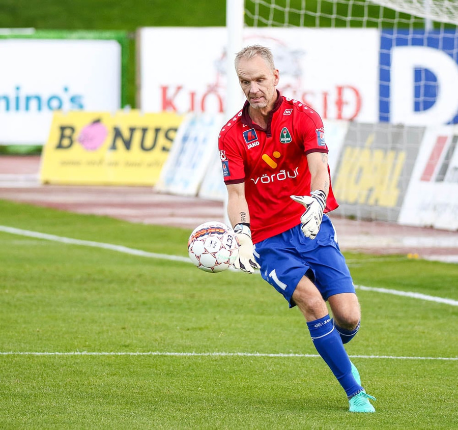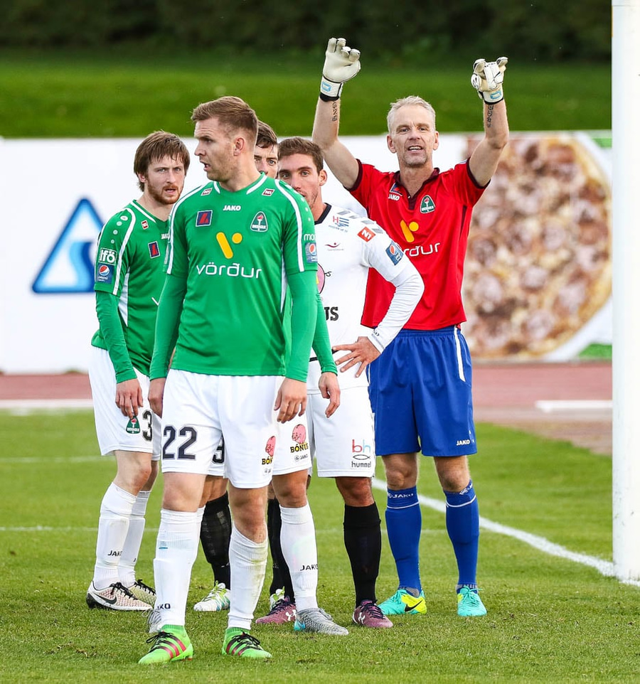 Árni Vilhjálmsson skallar aukaspyrnu frá Oliver í netið.....en er dæmdur rangstæður.