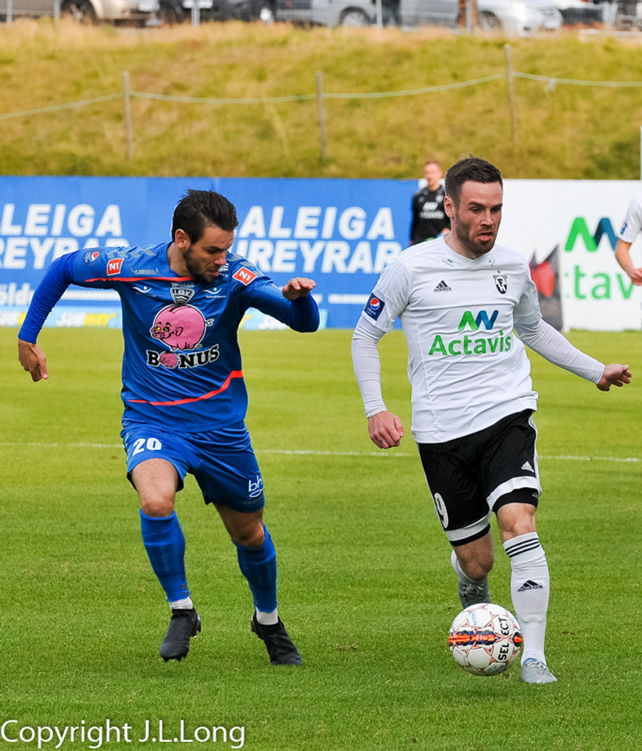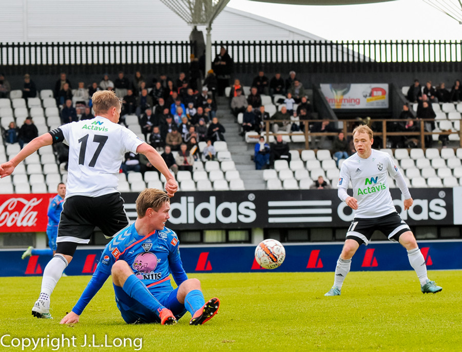 Heeeewson!!! Boltinn skaust af Seers inn fyrir á Hewson sem teygði sig í boltann og náði lausu skoti sem Halldór Páll varði vel.