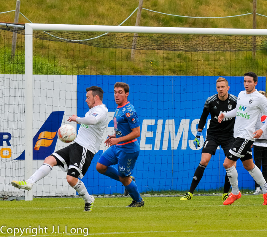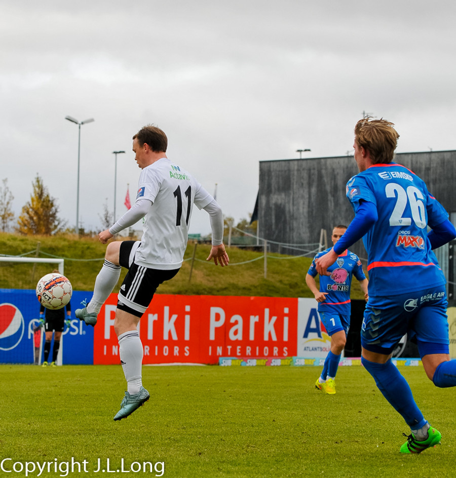 Atli Guðna fær boltann vinstra megin í teignum og tekur skot í fyrstu snertingu. Yfir fór hann.