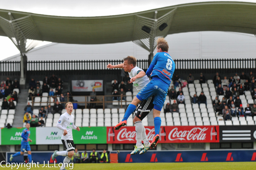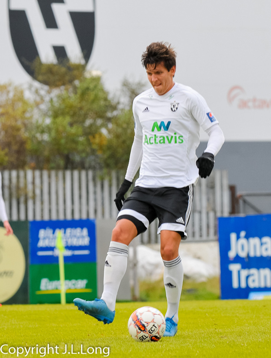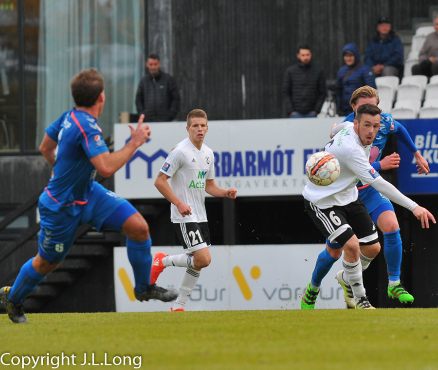 Hewson með góðan sprett og sendir stórhættulega sendingu fyrir en Jón bombar í horn.