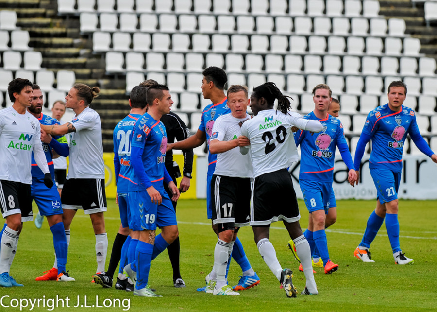 Miðverðirnir voru ansi ósáttir hvor við annan og uppskáru sitt hvort spjaldið. Hasar eftir að flautað var til hálfleiks en nú ættu allir að geta fengið sér te og róað sig niður. Heldur dapur fyrri hálfleikur á enda.