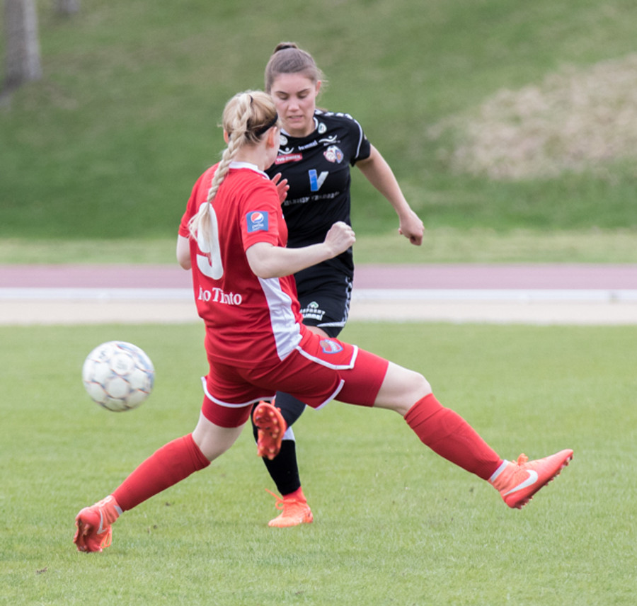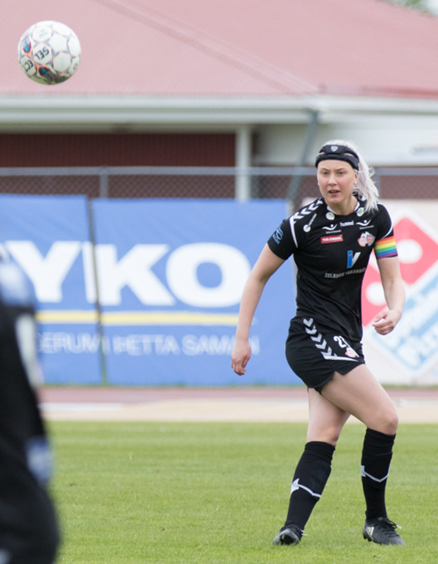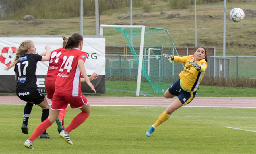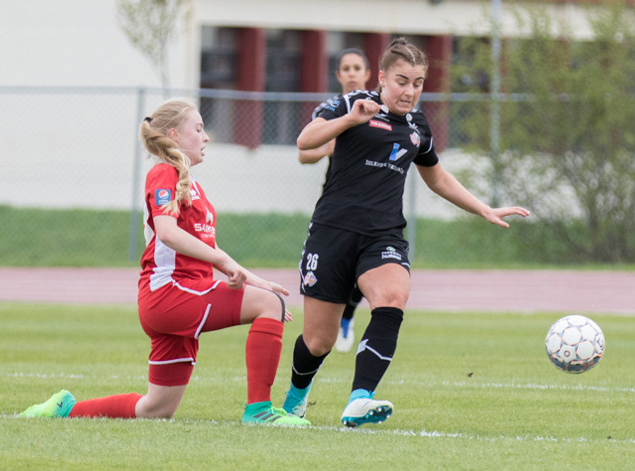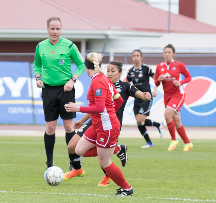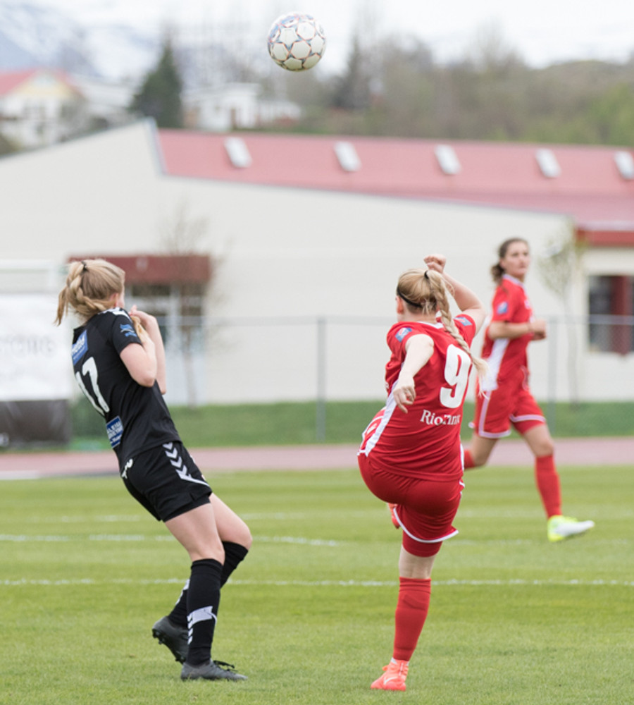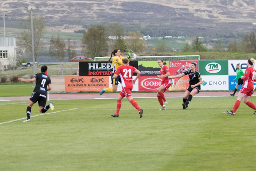 Hulda Björg á skalla á markið úr aukaspyrnunni sem Tori á í engum vandræðum með. Arnar Þór flautar til hálfleiks um leið og Tori spyrnir frá markinu.