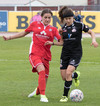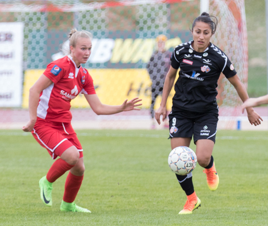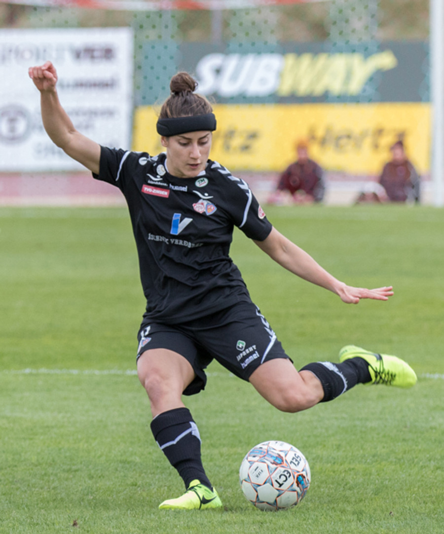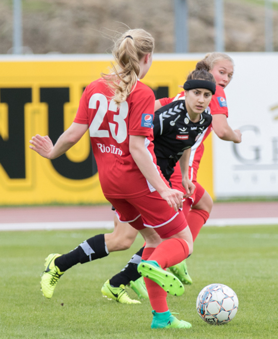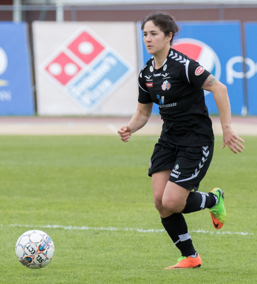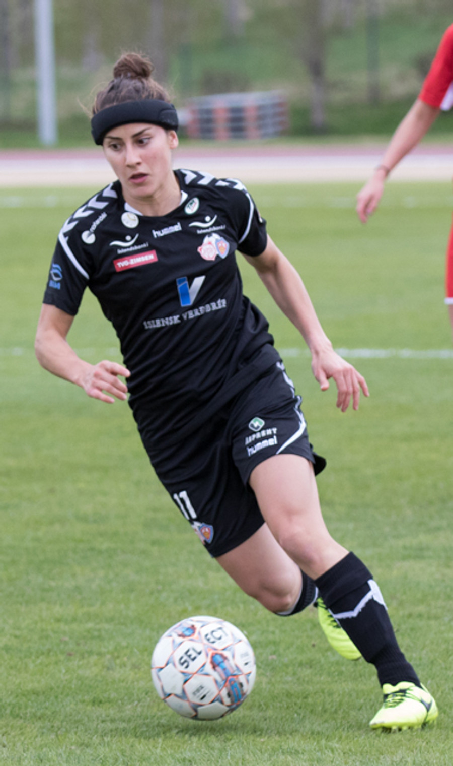 Hildigunnur Ólafsdóttir fær gult spjald. Sparkar í Zanetu sem liggur eftir á vellinum.