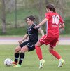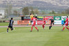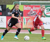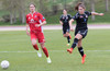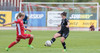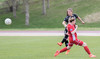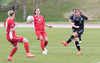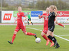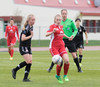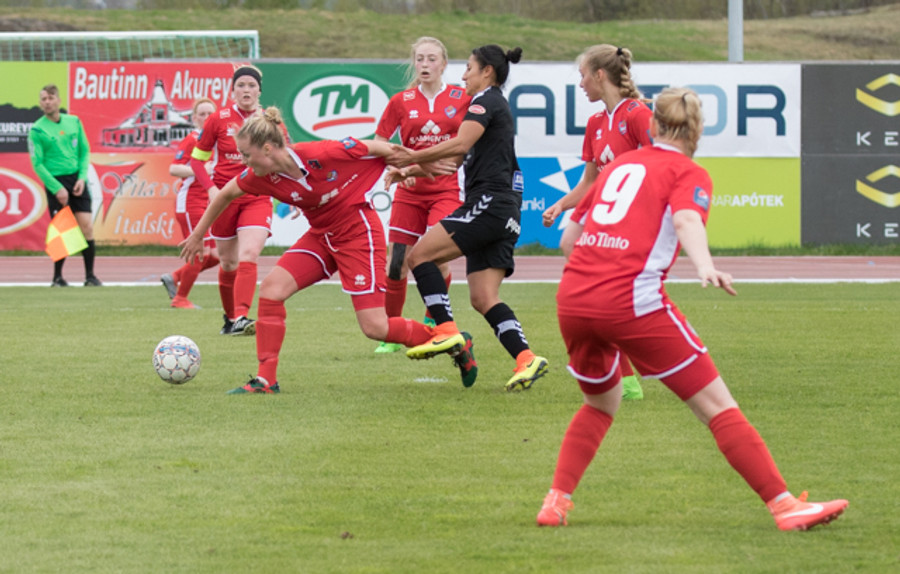 Haukar byrja með boltann og sækja að Glerárskóla. Haukar spila í rauðum búningum, Þór/KA í svörtum.