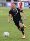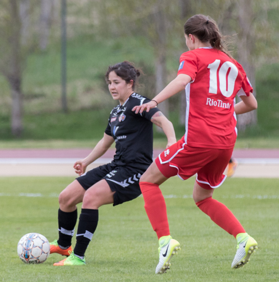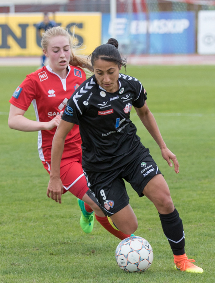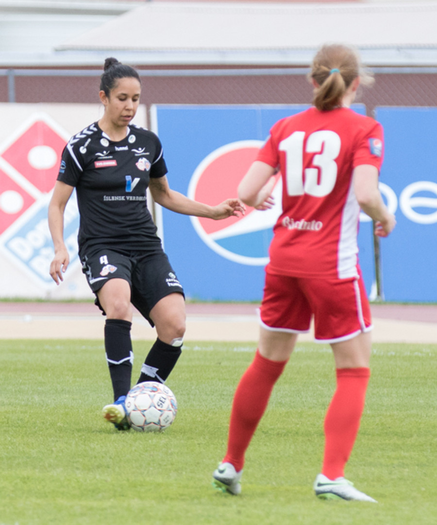 Sæunn Björnsdóttir fær fyrsta gula spjald leiksins. Tekur Nataliu Gomez niður á miðjunni.