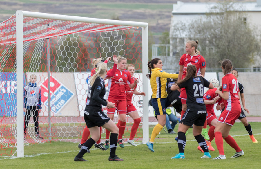 Sandra Mayor nálægt því að koma Þór/KA yfir en Arnar Þór dæmir hendi á hana áður en skot hennar er varið á línu.