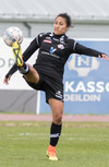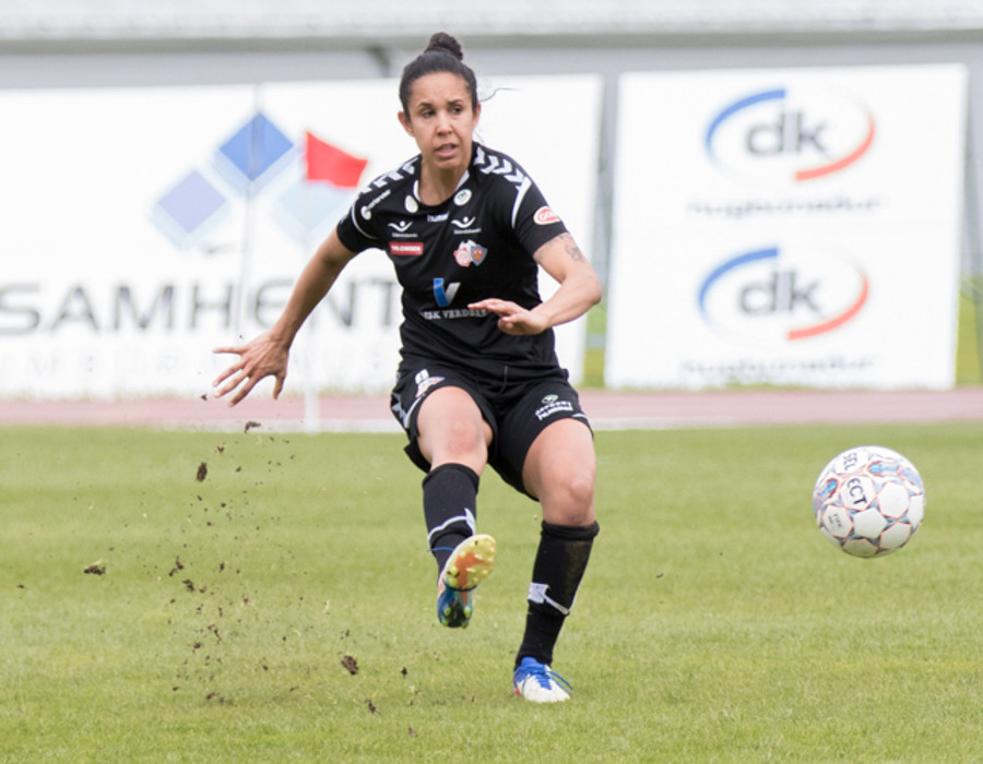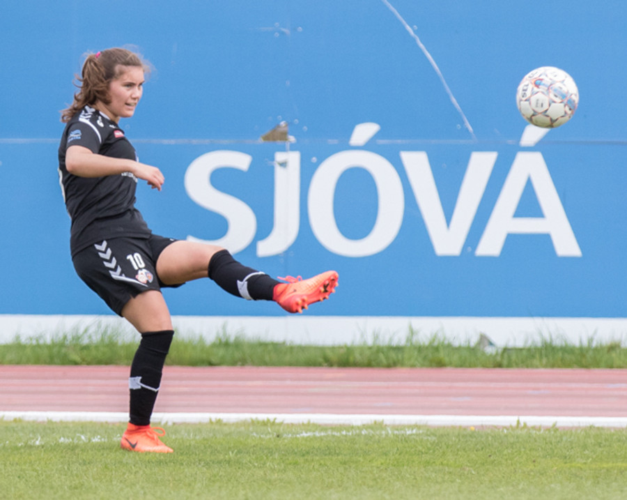 Sigríður Lára með skot fyrir gestina af 25 metra færi. Vinstri fótar á lofti. Yfir markið!