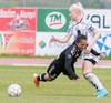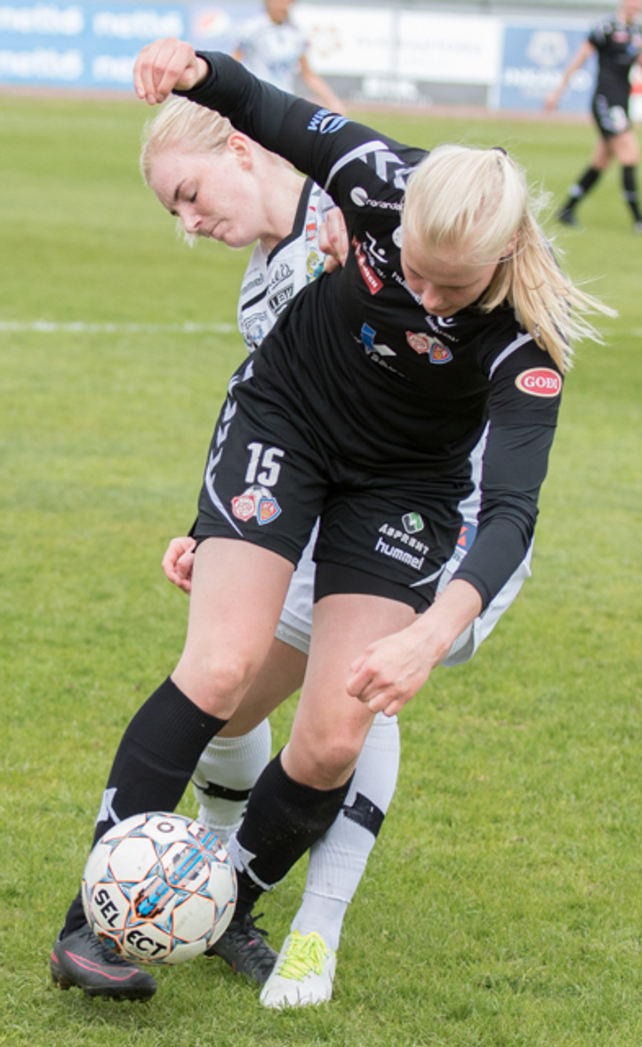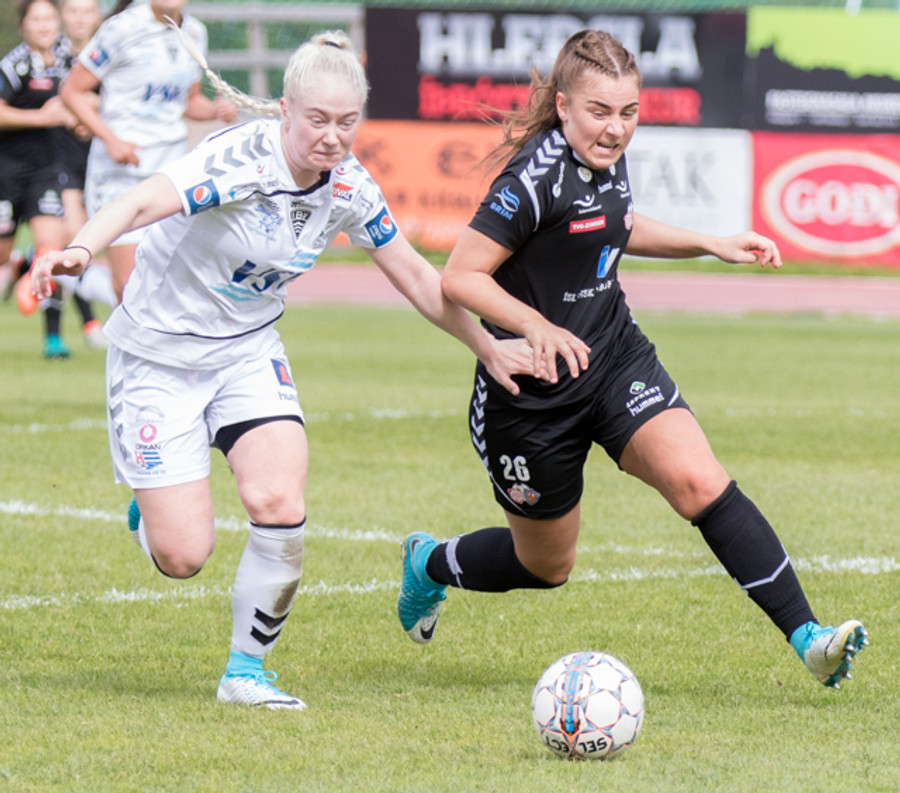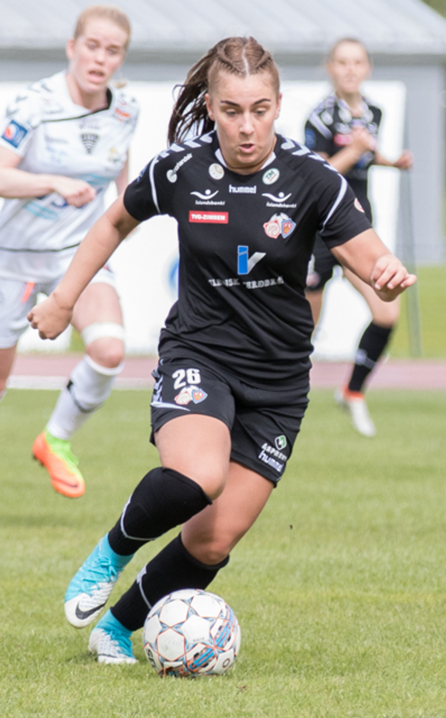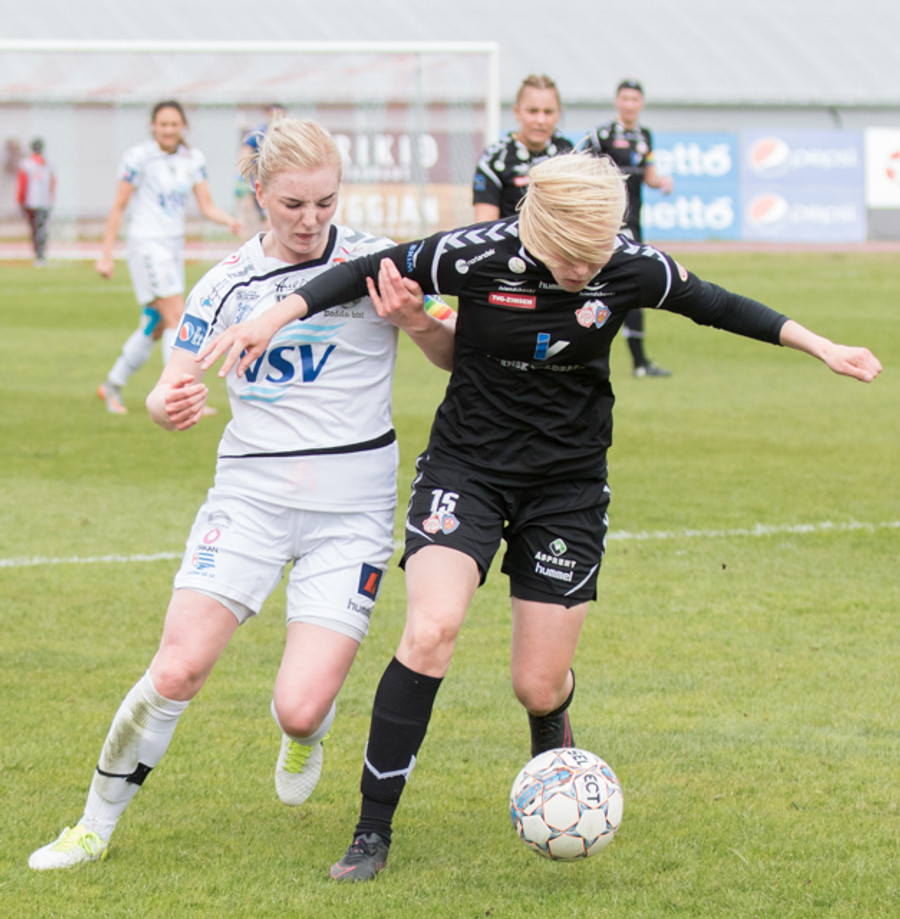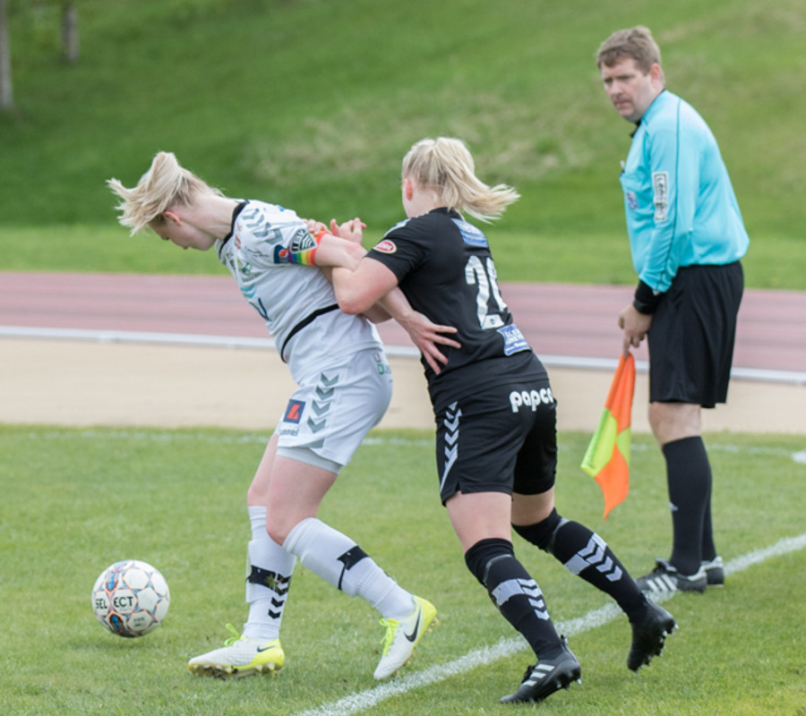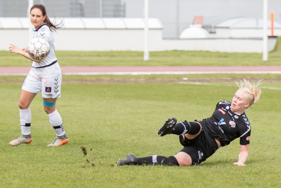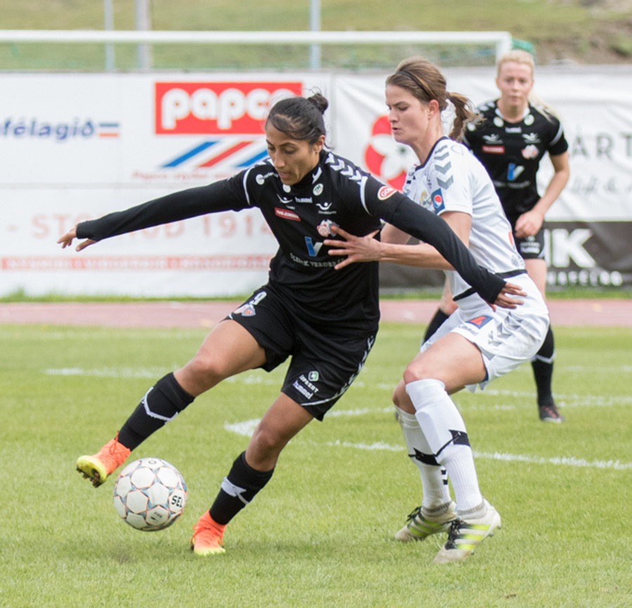 Hulda Ósk gerir hér grín að Sóleyju á hægri vængnum með leikni sinni. Er komin framhjá henni þegar dómarinn flautar aukaspyrnu. Ekki mikill hagnaður þarna!