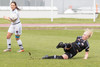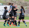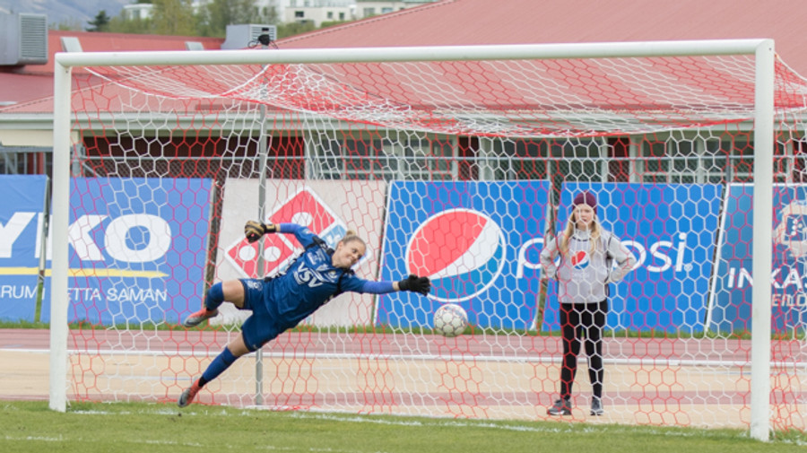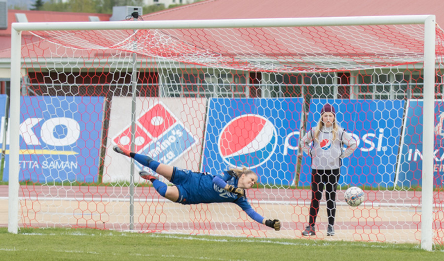 Spyrnan skölluð frá en Cloe nær skoti. Bryndís skutlar sér eftir þessu og ver vel niðri við stöng.