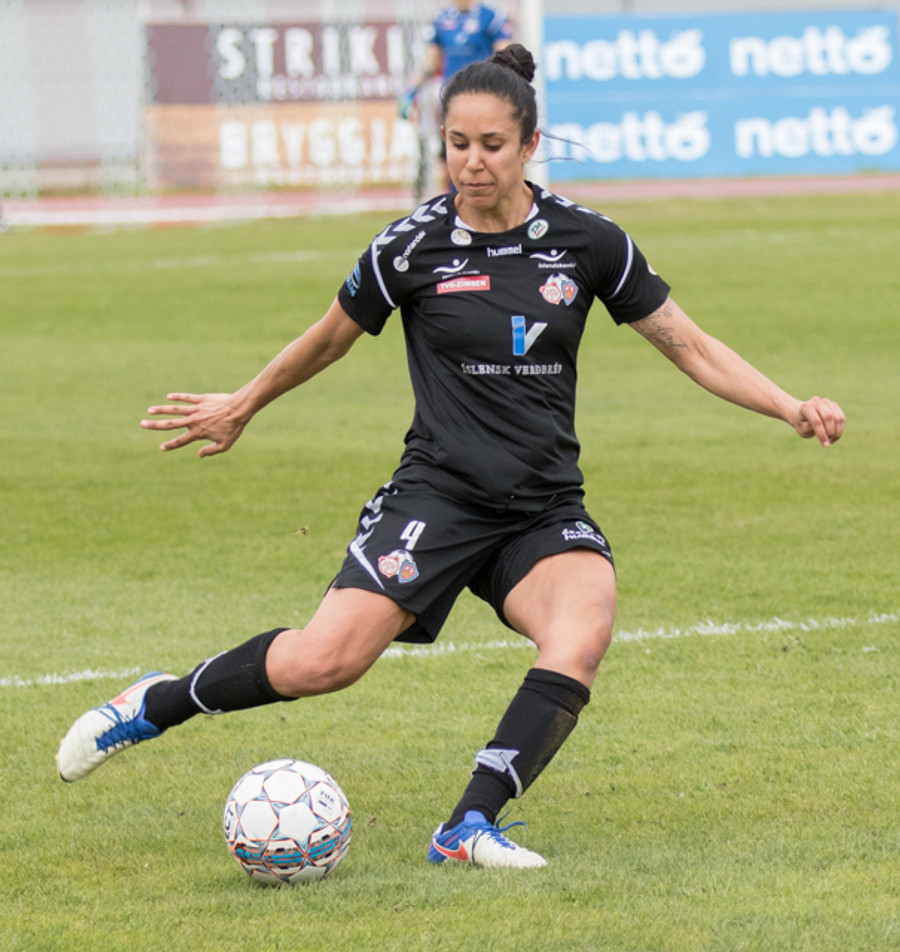 Sandra Stephany fær aukaspyrnu fyrir heimakonur á góðum stað. Í beinni línu við markið, rétt fyrir framan D-bogann.