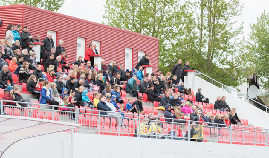 5 mínútur í leik og fólk er farið að mæta í stúkuna. Vallarþulurinn er að lesa upp liðin og þetta er allt að gerast.